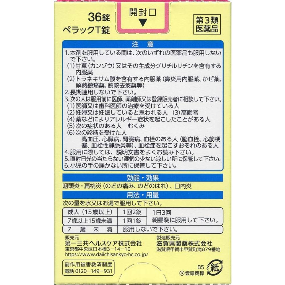 商品説明ペラックT錠は、炎症やアレルギーをおさえる作用のあるトラネキサム酸、カンゾウ乾燥エキスの他に、タンパク質や脂質の代謝に関与し、皮膚や粘膜の機能を正常にはたらかせるビタミンB2、ビタミンB6と体力消耗に効果のあるビタミンCの3種のビタミンを配合した薬です。 空気の乾燥・汚れやかぜなどからくるのどの炎症である咽頭炎・扁桃炎(のどのはれ、のどの痛み)および口内の炎症である口内炎によく効き、7歳の小児から成人まで服用できる薬です。 ●トラネキサム酸配合 炎症やアレルギーをおさえる作用のあるトラネキサム酸を、1日量あたり750mg配合しています。 ●のどのはれ、のどの痛みにすぐれた効果 トラネキサム酸とカンゾウ乾燥エキスの2つの成分が有効に作用して、口内およびのどの炎症をおさえます。 ●眠くなる成分を含みません 抗ヒスタミン薬を配合していませんので、眠くなりません。