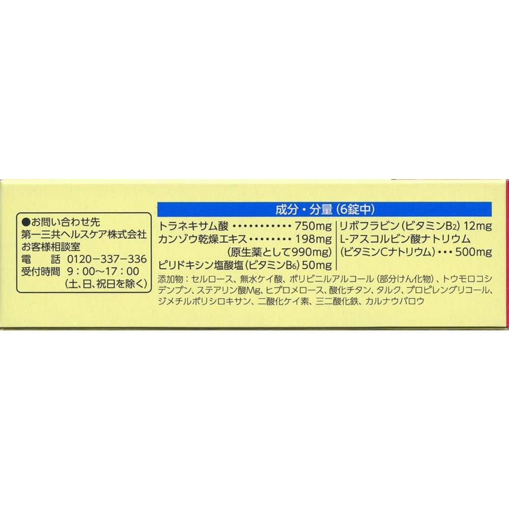 ■してはいけないこと (守らないと現在の症状が悪化したり、副作用が起こりやすくなります) 1.本剤を服用している間は、次のいずれの医薬品も服用しないで下さい。 (1)甘草(カンゾウ)又はその主成分グリチルリチンを含有する内服薬 (むくみ、血圧上昇及び筋疾患(ミオパチー)等が起こることがあります) (2)トラネキサム酸を含有する内服薬 (鼻炎用内服薬、かぜ薬、解熱鎮痛薬、鎮咳去痰薬等) 2.長期連用しないで下さい。 ■相談すること 1.次の人は服用前に医師、薬剤師又は登録販売者に相談して下さい。 (1)医師又は歯科医師の治療を受けている人 (2)妊婦又は妊娠していると思われる人 (3)高齢者 (4)薬などによりアレルギー症状を起こしたことがある人 (5)次の症状のある人 むくみ (6)次の診断を受けた人 高血圧、心臓病、腎臓病、血栓のある人(脳血栓、心筋梗塞、血栓性静脈炎等)、血栓症を起こすおそれのある人 2.服用後、次の症状があらわれた場合は副作用の可能性がありますので、直ちに服用を中止し、この文書を持って医師、薬剤師又は登録販売者に相談して下さい。 〔関係部位〕 〔症 状〕 皮 膚 : 発疹・発赤、かゆみ 消 化 器 : 吐き気・嘔吐、胸やけ、食欲不振もしくは食欲増進、胃部不快感 精神神経系 : めまい 泌 尿 器 : 頻尿 まれに下記の重篤な症状が起こることがあります。その場合は直ちに医師の診療を受けて下さい。 〔症状の名称〕偽アルドステロン症、ミオパチー 〔症 状〕手足のだるさ、しびれ、つっぱり感やこわばりに加えて、脱力感、筋肉痛があらわれ、徐々に強くなる。 3.服用後、次の症状があらわれることがありますので、このような症状の持続又は増強が見られた場合には、服用を中止し、この文書を持って医師、薬剤師又は登録販売者に相談して下さい。 下痢 4.5~6日間服用しても症状がよくならない場合は服用を中止し、この文書を持って医師、薬剤師又は登録販売者に相談して下さい。