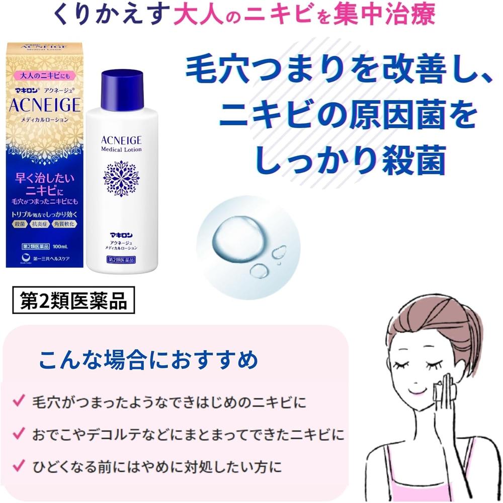 ・患部を清潔にした上でお薬を使用しましょう! ・日頃からお肌をキレイにすることはもちろんですが、お肌に触れる衣類やタオルなども清潔なものを使用するよう気をつけましょう。 ・糖質・脂質の多い食事を控え、睡眠を充分にとり体の中からもお肌のコンディションを整えましょう。 ・お子様に使用する際は、保護者の方が肌の状態をよく観察してご使用下さい。 ・2週間位使用しても症状がよくならない場合、お使いになって何か気になる症状が出た場合は、使用を中止し、医師・薬剤師・登録販売者にご相談下さい。商品説明しつこいニキビに、トリプル処方でしっかり効く ●優れた効果を有する殺菌成分「ベンゼトニウム塩化物」を配合したニキビ治療薬。 ●「殺菌×抗炎症×血行促進」 しつこいニキビにトリプル処方でしっかり効く。 ●さっぱりとしてべたつかない透明ローション。 ●「無香料・無着色・弱酸性」 お肌のことを考えた処方設計。 ●フェイスラインやデコルテのニキビにも。