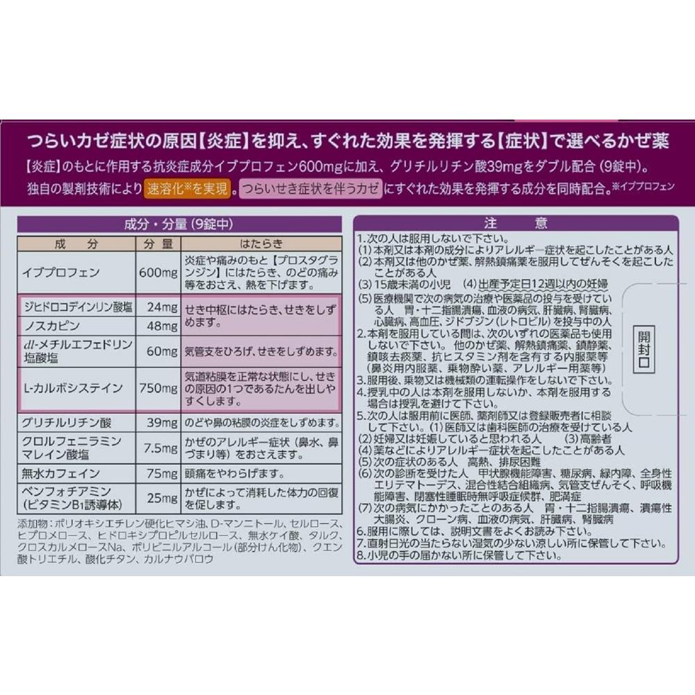 不快なカゼ症状の原因となる【炎症】をおさえる総合かぜ薬です。 1.抗炎症成分イブプロフェン600mgに加え、グリチルリチン酸39mgをダブル配合(9錠中)。のどの痛み、発熱などにすぐれた効果を発揮します。 2.独自の製剤技術によりイブプロフェンが早く溶け出し、効果を発揮します。 3.せき中枢にはたらく2つの鎮咳成分ジヒドロコデインリン酸塩とノスカピンに加え、dl-メチルエフェドリン塩酸塩が気管支をひろげて呼吸を楽にし、つらいせきをしずめます。また、去たん成分L-カルボシステインが、せきの原因の1つであるたんを出しやすくします。 4.抗ヒスタミン成分クロルフェニラミンマレイン酸塩が、カゼのアレルギー症状(鼻水・鼻づまり等)をおさえます。 5.携帯に便利なPTP包装です。