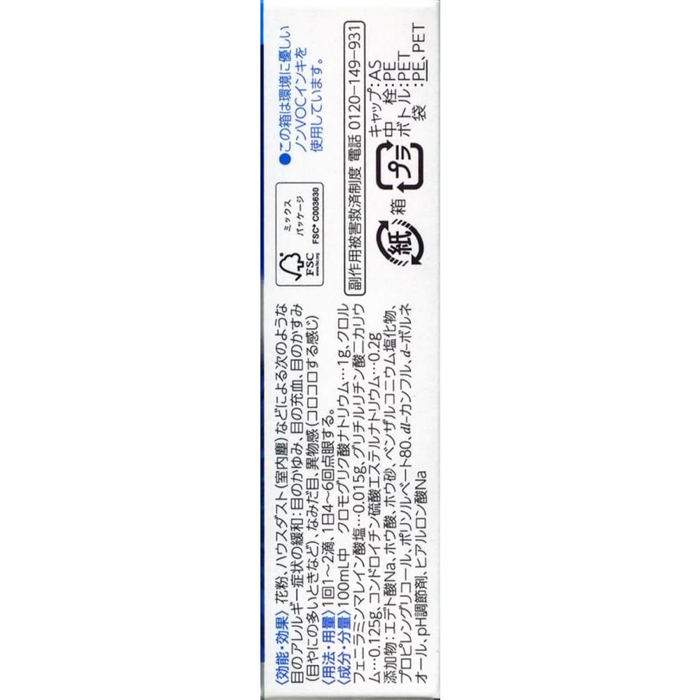 ・使用方法を守ってご使用下さい。 ・点鼻薬と併用する場合には、使用後、乗物または機械類の運転操作をしないで下さい。 ・小児に使用させる場合には、保護者の指導監督のもとに使用させてください。 ・コンタクトレンズを装着したまま使用しないでください。 ・目薬を使う前に目についた花粉などの原因物質を洗いながしましょう。 ・かゆくても目をこすらないように注意して下さい。 ・かゆみが強い時は冷たいタオルなどを目にあてるとおさまることもありますので、お試し下さい。 ・2日間位使用しても症状がよくならない場合、お使いになって何か気になる症状が出た場合は使用を中止し、医師・薬剤師・登録販売者にご相談下さい。 ・症状の改善が見られても2週間を超えて使用する場合は、医師・薬剤師・登録販売者にご相談下さい。 ・使用前に、よく添付文書をお読みになってからご使用下さい。その際、ご不明な点がございましたら、薬剤師・登録販売者にご相談下さい。商品説明1.抗アレルギー剤「クロモグリク酸ナトリウム」が,アレルギー誘発物質の放出を抑え,つらいアレルギー症状を緩和します。 2.「クロルフェニラミンマレイン酸塩」が,アレルギー症状を起こすヒスタミンの受容体結合をブロックし,目のかゆみを抑えます。 3.「グリチルリチン酸二カリウム」が,アレルギー反応による目の炎症をしずめます。 4.「コンドロイチン硫酸エステルナトリウム」が,目のうるおいを保持し,角膜表面をいたわります。 5.爽快感のあるクールなさし心地です。