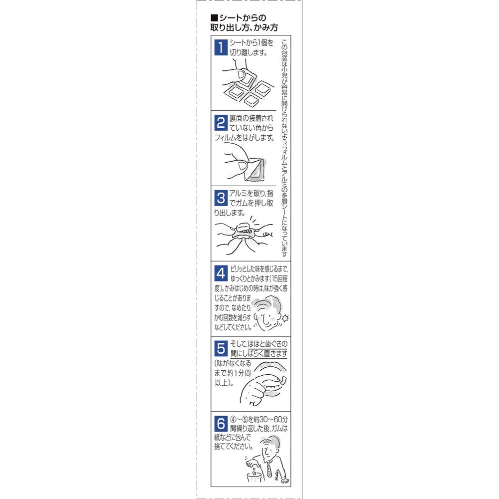 ●してはいけないこと (守らないと現在の症状が悪化したり,副作用が起こりやすくなる) 1. 次の人は使用しないこと (1)非喫煙者〔タバコを吸ったことのない人及び現在タバコを吸っていない人〕(吐き気、めまい、腹痛などの症状があらわれることがある。) (2)すでに他のニコチン製剤を使用している人 (3)妊婦又は妊娠していると思われる人 (4)重い心臓病を有する人 1)3ヵ月以内に心筋梗塞の発作を起こした人 2)重い狭心症と医師に診断された人 3)重い不整脈と医師に診断された人 (5)急性期脳血管障害(脳梗塞,脳出血等)と医師に診断された人 (6)うつ病と医師に診断された人 (7)本剤又は本剤の成分によりアレルギー症状(発疹・発赤,かゆみ,浮腫等)を起こしたことがある人 (8)あごの関節に障害がある人 2. 授乳中の人は本剤を使用しないか, 本剤を使用する場合は授乳を避けること (母乳中に移行し、乳児の脈が速まることが考えられる。) 3. 本剤を使用中あるいは使用直後に次のことをしないこと (1)喫煙 (2)ニコチンパッチ製剤の使用 4. 6ヵ月を超えて使用しないこと ●相談すること 1. 次の人は使用前に医師,歯科医師,薬剤師又は登録販売者に相談すること (1)医師又は歯科医師の治療を受けている人 (2)他の薬を使用している人 (他の薬の作用に影響を与えることがある。) (3)高齢者及び20歳未満の人 (4)薬などによりアレルギー症状を起こしたことがある人 (5)次の症状のある人 腹痛,胸痛,口内炎,のどの痛み・のどのはれ (6)次の診断を受けた人 心臓疾患(心筋梗塞,狭心症,不整脈),脳血管障害(脳梗塞,脳出血等),バージャー病(末梢血管障害),高血圧,甲状腺機能障害,褐色細胞腫,糖尿病(インスリン製剤を使用している人),咽頭炎,食道炎,胃・十二指腸潰瘍,肝臓病,腎臓病(症状を悪化させたり,現在使用中の薬の作用に影響を与えることがある。) 2.使用後,次の症状があらわれた場合は副作用の可能性があるので,直ちに使用を中止し,この文書を持って医師,薬剤師又は登録販売者に相談すること [関係部位:症状] 口・のど:口内炎,のどの痛み 消化器:吐き気・嘔吐,腹部不快感,胸やけ,食欲不振,下痢 皮膚:発疹・発赤,かゆみ 精神神経系:頭痛,めまい,思考減退,眠気 循環器:動悸 その他:胸部不快感,胸部刺激感,顔面潮紅,顔面浮腫,気分不良 3 .使用後,次のような症状があらわれることがあるので,このような症状の持続又は増強が見られた場合には,使用を中止し,医師,歯科医師,薬剤師又は登録販売者に相談すること (1)口内・のどの刺激感,舌の荒れ,味の異常感,唾液増加,歯肉炎 (ゆっくりかむとこれらの症状は軽くなることがある。) (2)あごの痛み (他に原因がある可能性がある。) (3)しゃっくり,げっぷ 4.誤って定められた用量を超えて使用したり,小児が誤飲した場合には,次のような症状があらわれることがあるので,その場合には,直ちに医師,薬剤師又は登録販売者に相談すること 吐き気,唾液増加,腹痛,下痢,発汗,頭痛,めまい,聴覚障害,全身脱力(急性ニコチン中毒の可能性がある。) 5.3ヵ月を超えて継続する場合は,医師,薬剤師又は登録販売者に相談すること (長期・多量使用によりニコチン依存が本剤に引き継がれることがある。)