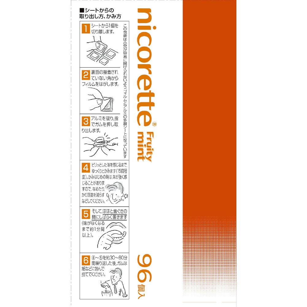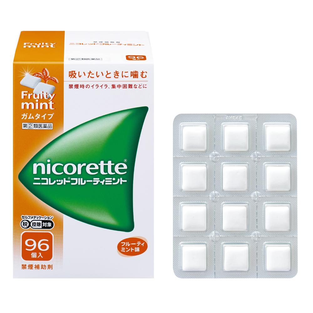 ・タバコを吸うのを完全に止めてから使用して下さい。タバコが吸いたくなったら、ゆっくり噛んで下さい。早く噛むと胃が荒れたりすることがあります。 ・コーヒーや炭酸飲料を飲んだ後は、しばらくはガムを使用しないで下さい。また、口内に使用する吸入剤やスプレー剤とは同時に使用しないで下さい。 ・その他も、用法・用量をよく読み、ご使用下さい。 ・使用は、3ヶ月をめどとし、6ヶ月を超えて使用しないようにして下さい。なお、6ヶ月経っても禁煙できない場合は、受診をお勧めします。 ・お使いになって何か気商品説明ニコレットフルーティミントはタバコをやめたいと望む人のための医薬品で,禁煙時のイライラ・集中困難などの症状を緩和します。 (タバコをきらいにさせる作用はありません) 使用期間は3ヵ月をめどとし, 使用量を徐々に減らすことで, あなたを無理のない禁煙へ導きます。 タバコを吸わない人や現在吸っていない人は,身体に好ましくない作用を及ぼしますので使用しないでください。 シュガーレスコーティングで,かみやすいニコチンガム製剤です。