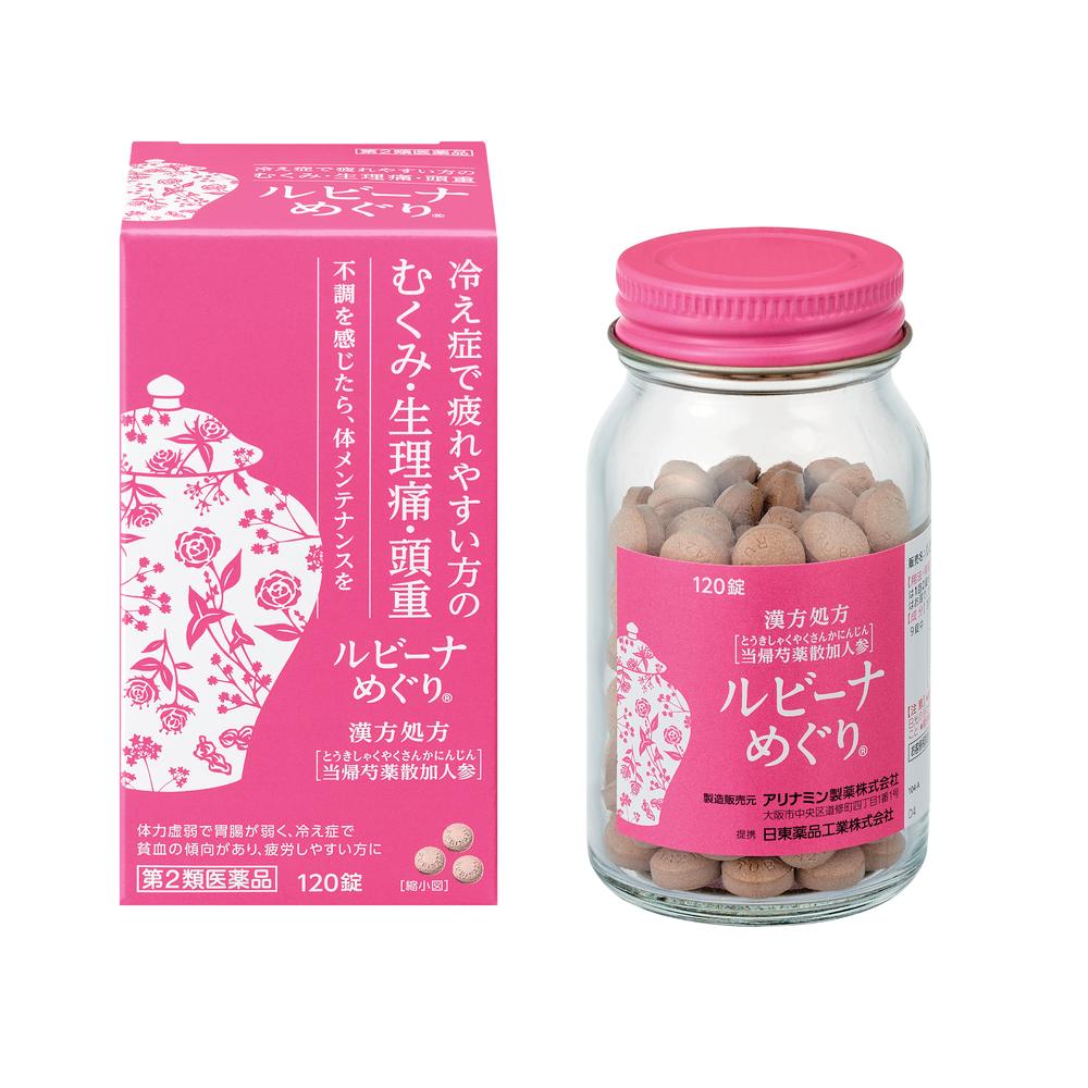 ・つらい時は無理せず、ゆっくり身体を休めましょう。 ・お使いになって何か気になる症状が出た場合は、使用を中止し、医師・薬剤師・登録販売者にご相談下さい。 ・使用前に、よく添付文書をお読みになってからご使用下さい。その際、ご不明な点がございましたら、薬剤師・登録販売者にご相談下さい。4987123702126商品説明ルビーナめぐりは、漢方処方「当とう帰き 芍しゃく薬やく散さん加か 人にん参じん」にもとづく製品です。 次のはたらきにより体全体のバランスを良くしていき、つらいむくみ・生理痛・ 頭重などを改善します。 ・ 血のめぐりを良くしていくことで、手足の先から体を温めます。 ・ 水のめぐりを良くしていくことで、冷えの原因となる水が体にたまっている のを改善します。 ・ 弱った胃腸のはたらきを活発にすることで、体を芯から温めます。 体力虚弱で胃腸が弱く、冷え症で貧血の傾向があり、疲労しやすい方に適しています。 特有の香味をもったかっ色の錠剤です。