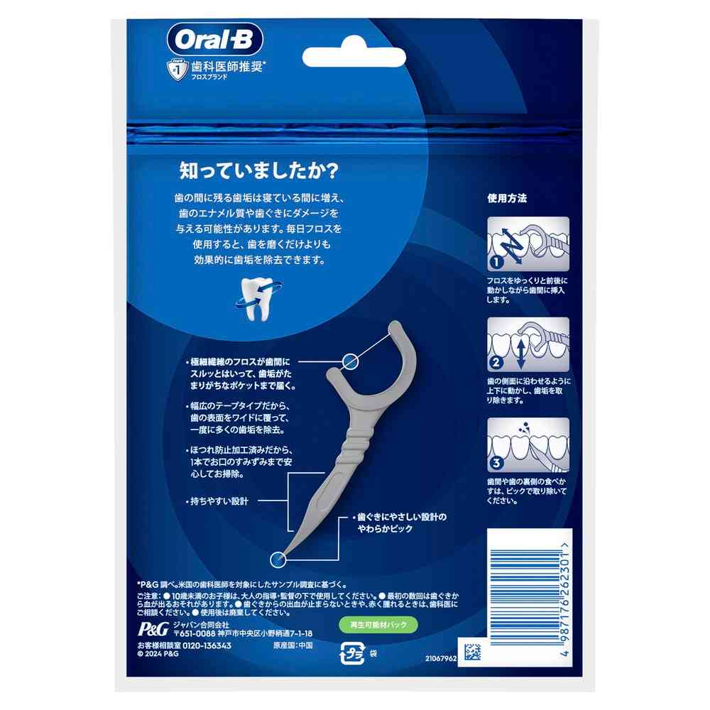 オーラルB#1 歯科医師推奨フロスブランド 食べかすや歯垢を除去 ・極細繊維のフロスが歯間にスルッと入って、歯垢がたまりがちなポケットまで届きます。 ・幅広のテープタイプだから、歯の表面をワイドに覆って一度に多くの歯垢を除去。 ・ほつれ防止加工済みだから、1本でお口のすみずみまで安心してお掃除。 ・ハンドルは持ちやすい設計と歯ぐきに優しいやわらかピック。 ・これまでプラスチックを使用していたパッケージを「紙」とリサイクル可能な「ポリ袋」へ変更。環境にやさしいパッケージに大幅改良。
