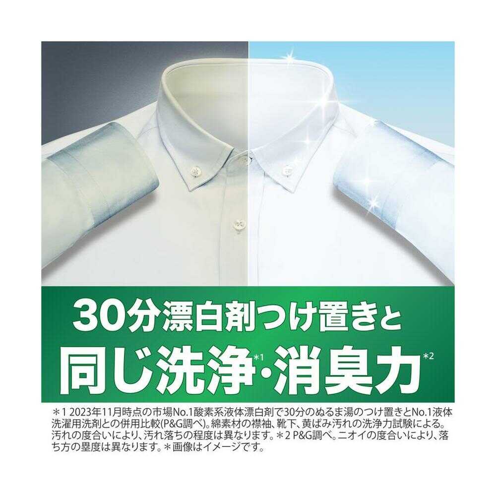 漂白剤つけ置きパワーin*の「完全楽スゴ洗剤」ジェルボール。 ・30分漂白剤つけ置きと同じ洗浄・消臭力* ・厚手のパーカーやタオルも、部屋干し臭ゼロへ ・たった1粒のジェルボールで、「楽」なのに「スゴい」、楽スゴ洗剤 ・洗濯槽のカビ防止 ・洗濯槽クリーナーなしでカビ対策OK *2023年11月時点の市場No.1酸素系液体漂白剤で30分のぬるま湯のつけ置きとNo.1液体洗濯用洗剤との併用比較(P&G調べ)。綿素材の襟袖、靴下、黄ばみ汚れの洗浄力試験による。汚れの度合いにより、汚れ落ちの程度は異なります。