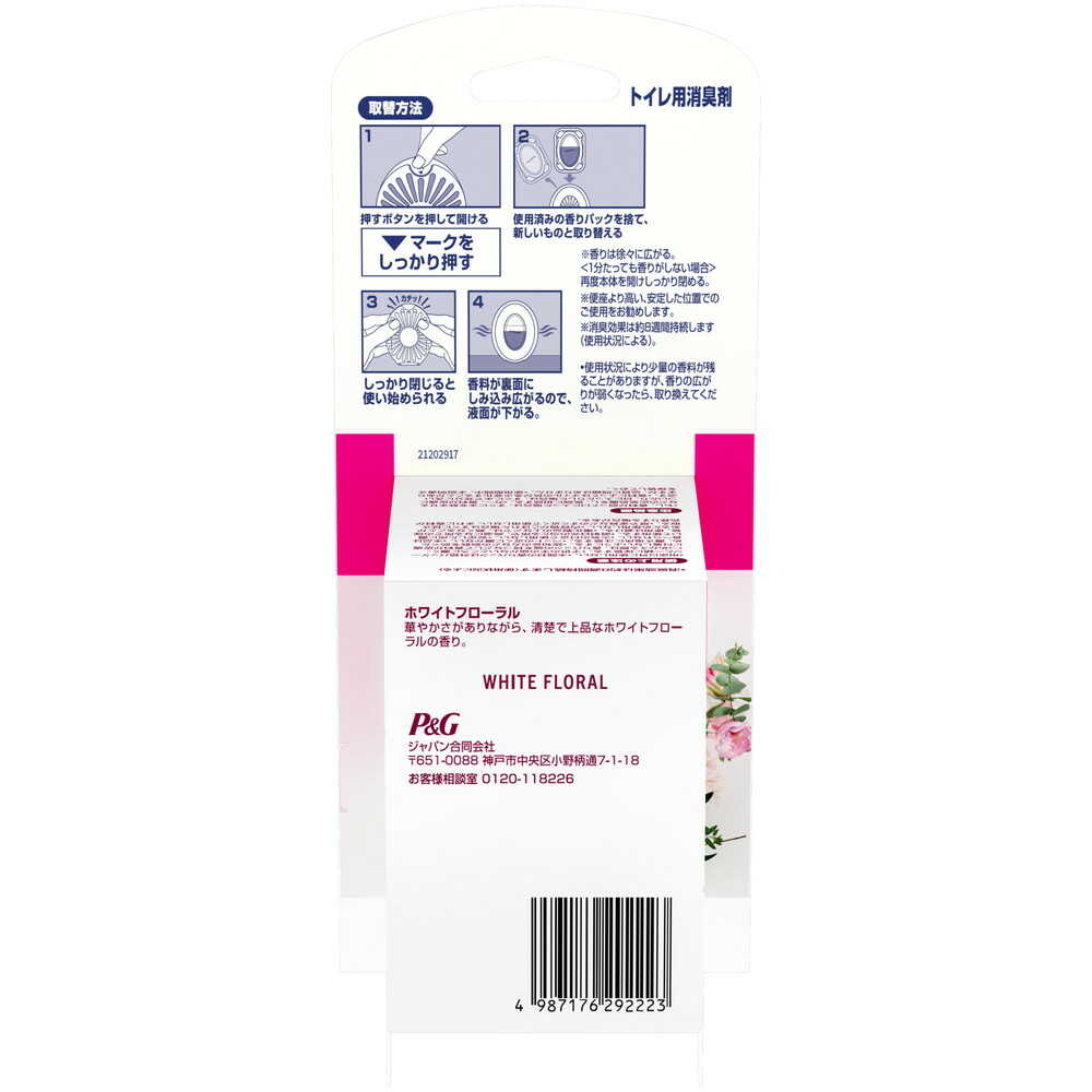 生まれかわった!つめかえタイプ 旧タイプにはつめかえできません。 トイレのニオイ分子は、壁や床の小さな凹凸に隠れています。 ファブリーズのトイレ用消臭剤は、室内の空気を継続的に消臭だけでなく、壁や床を防臭コートすることで、嫌なニオイが付着するのを防ぎます。 消臭効果は約8週間持続します(使用状況による)。 ホワイトフローラルの香り お得なつめかえパック4回分。必ず本体ケース入り商品をお買い求めください。