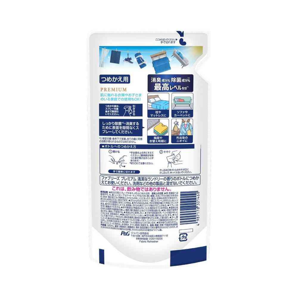 P&G、P&Gジャパン、P&Gジャパン合同会社、ピーアンドジー、ファブリーズ、お部屋用、衣類、コート、制服、ソファ、カーペット、家具、布用、除菌、消臭、防臭、抗菌、脱臭、芳香剤、スプレー、ミスト、スプレー、プレミアム、詰替、詰替え、詰め替え、レフィル、入替、中身