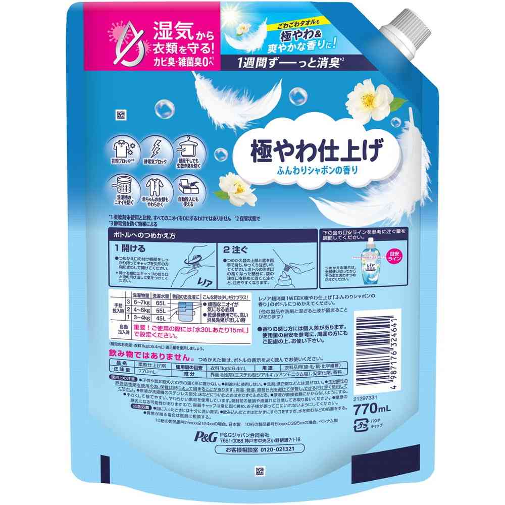 P&G、P&Gジャパン、P&Gジャパン合同会社、ピーアンドジー、レノア、超消臭、極やわ仕上げ、ふんわり、柔軟剤、ソフナー、香りづけ、洗濯、洗濯洗剤、詰替、詰替え、つめかえ、レフィル、シャボン、特大、大容量、詰め替え