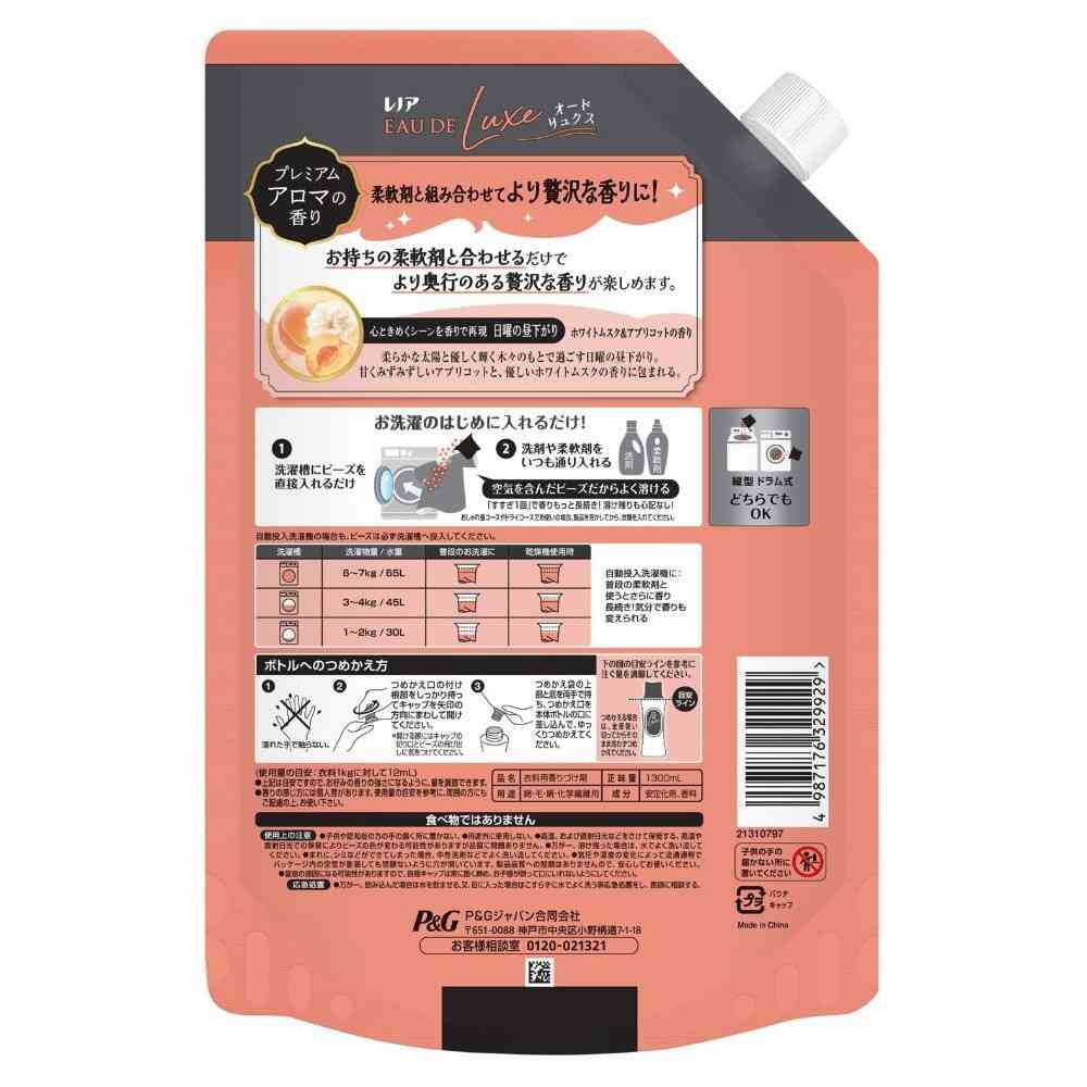 ●プレミアムアロマの香り ●柔軟剤と組み合わせてより贅沢な香りに ●お持ちの柔軟剤と合わせるだけでより奥行のある贅沢な香りが楽しめます ●心ときめくシーンを香りで再現 ●ホワイトムスク&アプリコットの香り:柔らかな太陽と優しく輝く木々のもとで過ごす日曜の昼下がり。甘くみずみずしいアプリコットと、優しいホワイトムスクの香りに包まれる。 ●縦型・ドラム式どちらでもOK ●お洗濯のはじめに入れるだけ