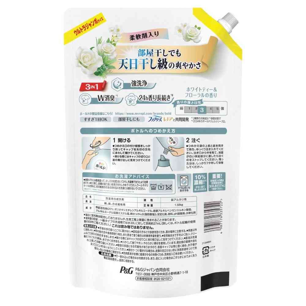 P&G、P&Gジャパン、P&Gジャパン合同会社、ピーアンドジー、ボールド、ジェル、ホワイトティー、フローラル、洗濯、洗濯洗剤、液体洗剤、柔軟剤、柔軟剤入り、洗浄、除菌、消臭、芳香、詰め替え、つめかえ、詰替え、レフィル