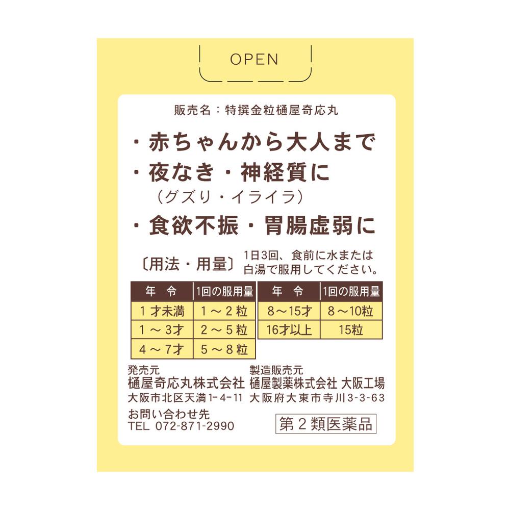 樋屋奇応丸(ひや・きおーがん)特撰金粒は5種類の厳選された生薬からなり、穏やかに作用して小児の神経質・胃腸虚弱などに効果をあらわします。