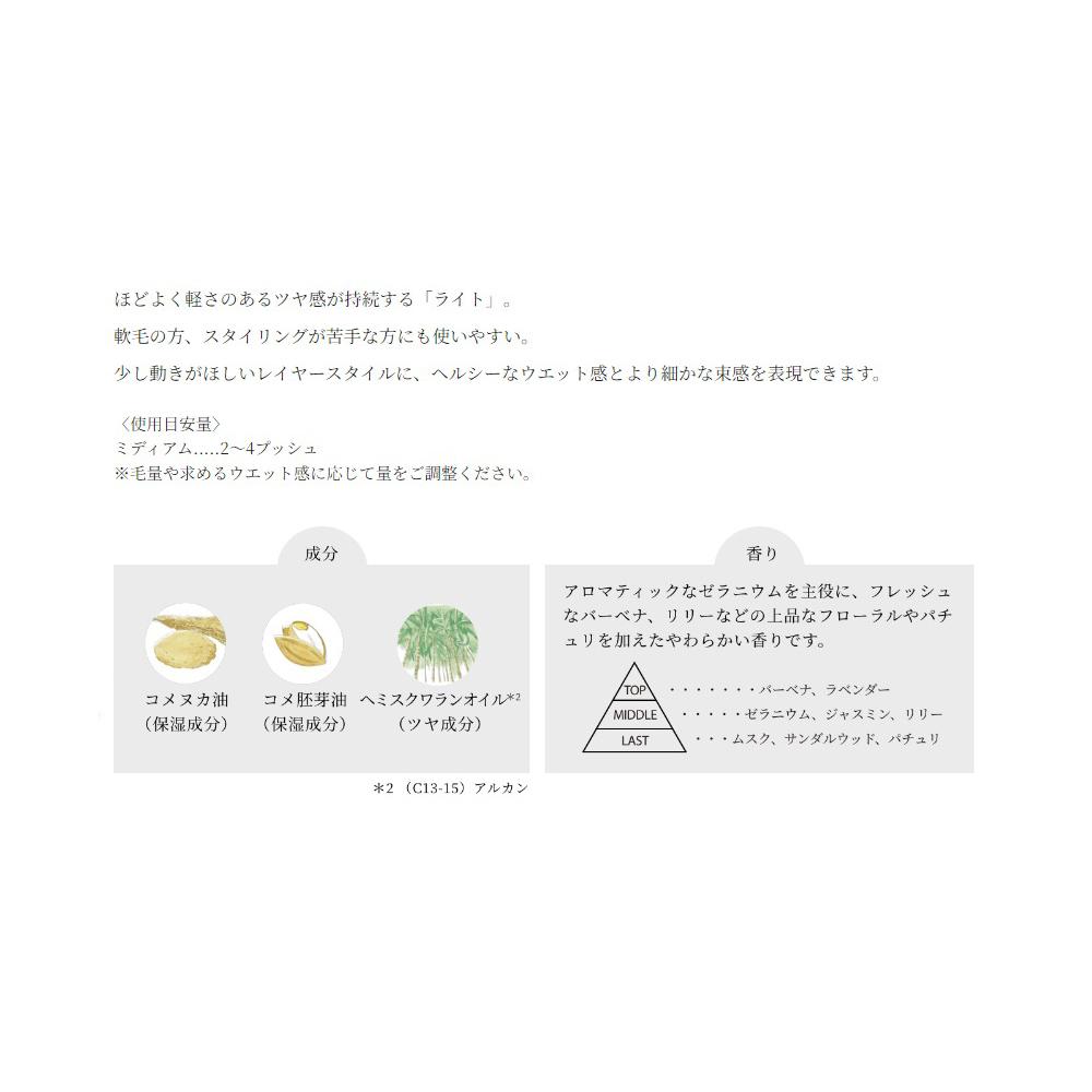 ほどよく軽さのあるツヤ感が持続する「ライト」。 軟毛の方、スタイリングが苦手な方にも使いやすい。 少し動きがほしいレイヤースタイルに、ヘルシーなウエット感とより細かな束感を表現できます。