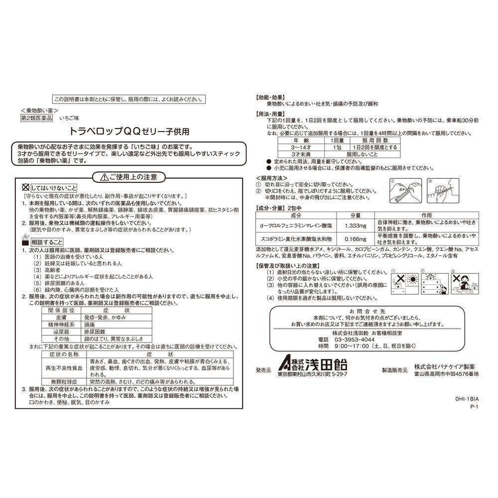 ・乗り物にのる30分前に服用して下さい。 ・修学旅行等に持たせる場合は、事前に服用方法をよく指導して下さい。 ・乗り物にのるにあたって、前夜は充分に睡眠をとり、当日の食事は飲みすぎ・食べすぎに注意し、体調を整えておきましょう。 ・服用後、乗物又は機械の運転操作をする際は、服用から十分に時間を置いて下さい。製品によって異なりますが、少なくとも、服用当日は控えていただくことをお勧めします。 ・お使いになって何か気になる症状が出た場合は、使用を中止し、医師・薬剤師・登録販売者にご相談下さ商品説明3才から服用できるゼリータイプの乗り物酔い薬です。