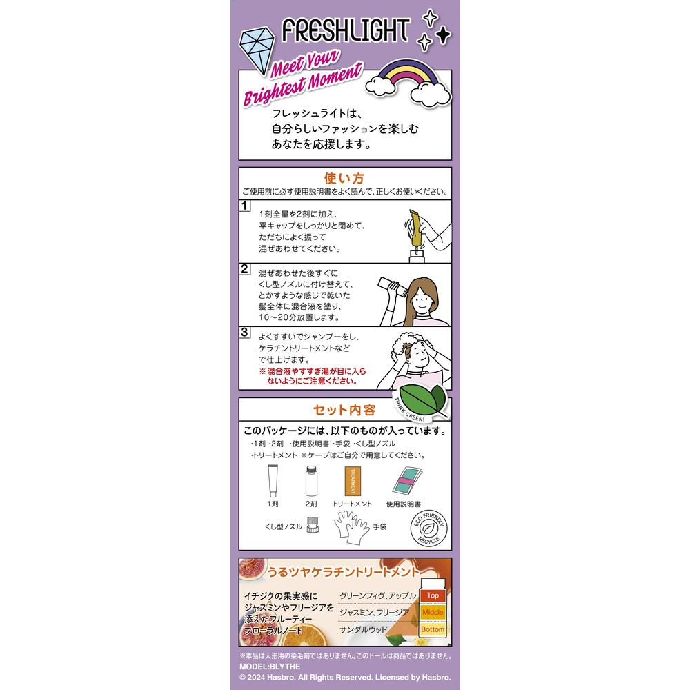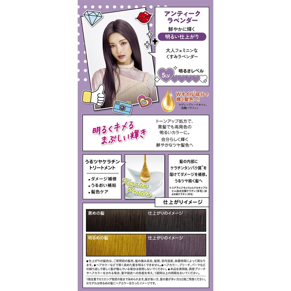 ダブルオイル処方で輝きのあるカワイイ髪色に。 サンフラワーオイル(うるおい成分)配合。 ツヤツヤでやわらかい髪質へ。 フレッシュライトオイルヘアマスク付き。