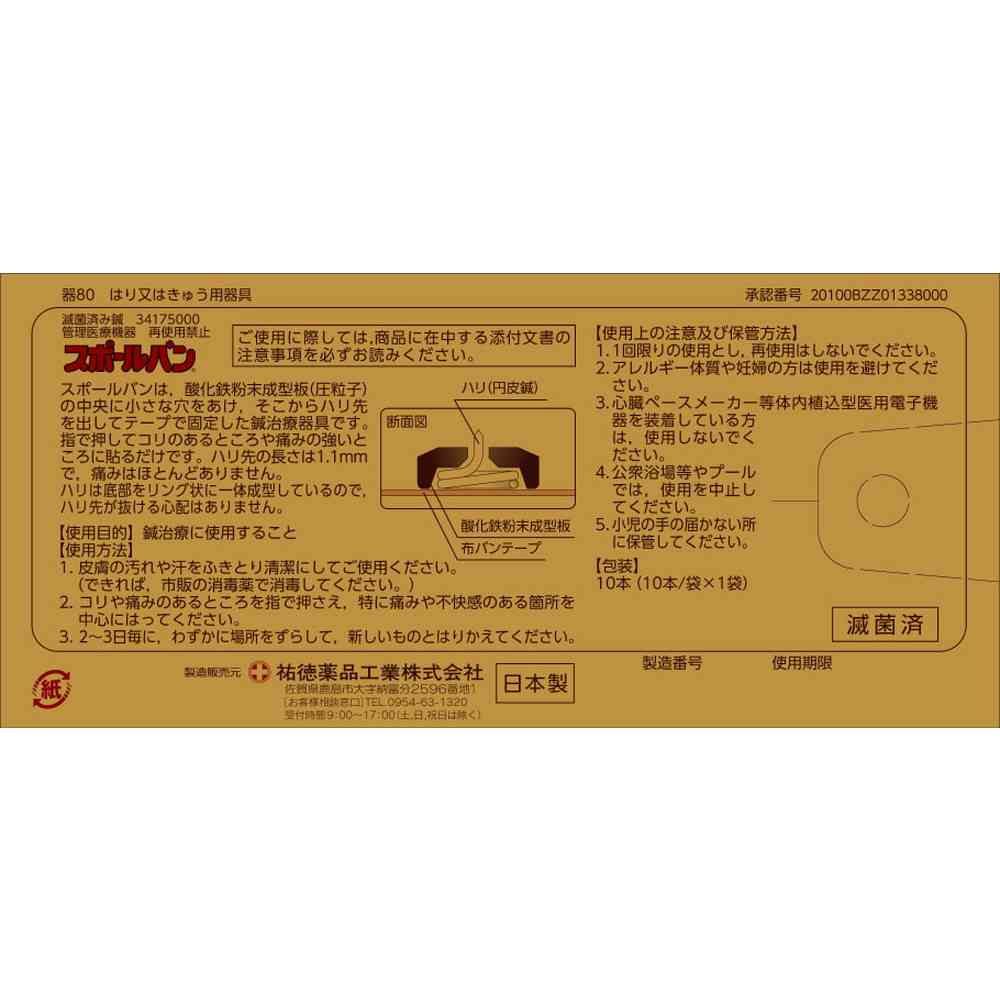 スポールバンは酸化鉄粉末成型板(圧粒子)の中央に小さな穴をあけ、そこからハリ先を出してテープで固定した鍼用器具です。 鍼長(突出部)は約1.1mmであり、皮内(約2mm)に留まるため、貼付時及び貼付中のハリ先による不快感もなく、かんたんな使用で鍼治療ができます。