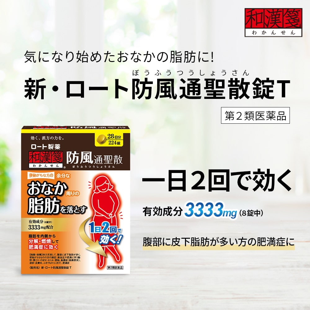 ・お薬に頼るだけでなく、バランスよい食事、適度な運動も心がけましょう。 ・お使いになって何か気になる症状が出た場合は、使用を中止し、医師・薬剤師・登録販売者にご相談下さい。 ・使用前に、よく添付文書をお読みになってからご使用下さい。その際、ご不明な点がございましたら、薬剤師・登録販売者にご相談下さい。4987241141548商品説明肥満を改善するためには、余分な脂肪を溜めずに落すことが大切です。防風通聖散は18種の生薬から成る漢方薬で、脂肪を分解・燃焼する働きがあり、おなか周りの脂肪が気になる肥満症を改善していきます。腹部に皮下脂肪が多く便秘がちな方の、肥満症、肥満に伴う便秘に。 「新・ロート防風通聖散錠」はその力を十分に引き出すため、使用する生薬の量や、成分の抽出にもこだわりました。