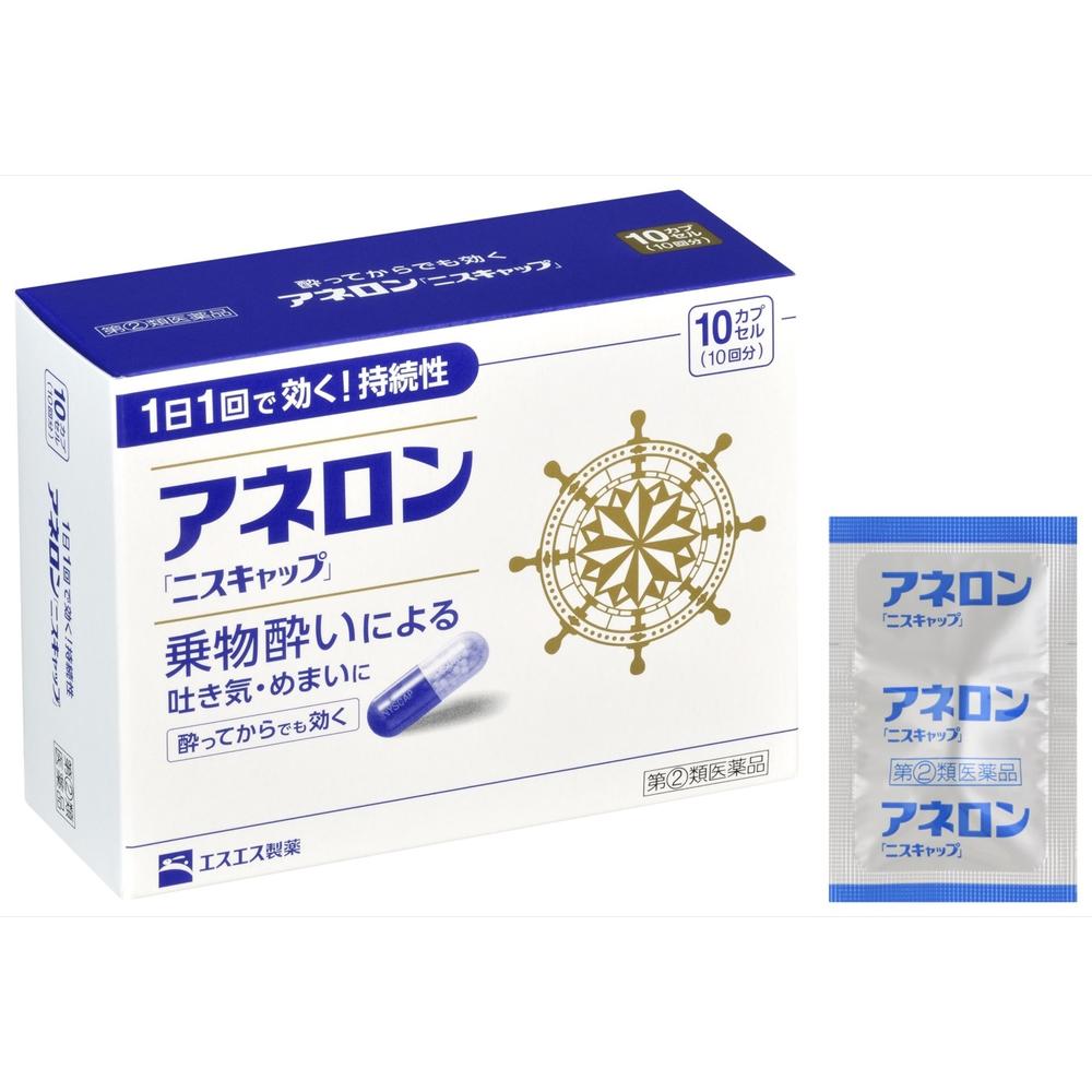 ・乗り物に乗る30分前に服用して下さい。なお、こちらのお薬の使用前後は、飲酒を控えて下さい。 ・修学旅行等に持たせる場合は、事前に服用方法をよく指導して下さい。 ・乗り物に乗るにあたって、前夜は充分に睡眠をとり、当日の食事は飲みすぎ・食べすぎに注意し、体調を整えておきましょう。 ・服用後、乗物又は機械類の運転操作をしないでください。製品によって異なりますが、少なくとも、服用当日は控えていただくことをお勧めします。 ・お使いになって何か気になる症状が出た場合は、使用を中止し、医師・薬剤師・登録販売者にご相談下さい。 ・使用前に、よく添付文書をお読みになってからご使用下さい。その際、ご不明な点がございましたら、薬剤師・登録販売者にご相談下さい。商品説明アネロン「ニスキャップ」は、効きめにムラがなく1日1回の服用で長時間効果が持続する持続性の乗物酔い薬です。 3種類の鎮静・鎮吐剤が配合されていますので、はきけ・めまい・頭痛のつらい乗物酔いにもよく効きます。