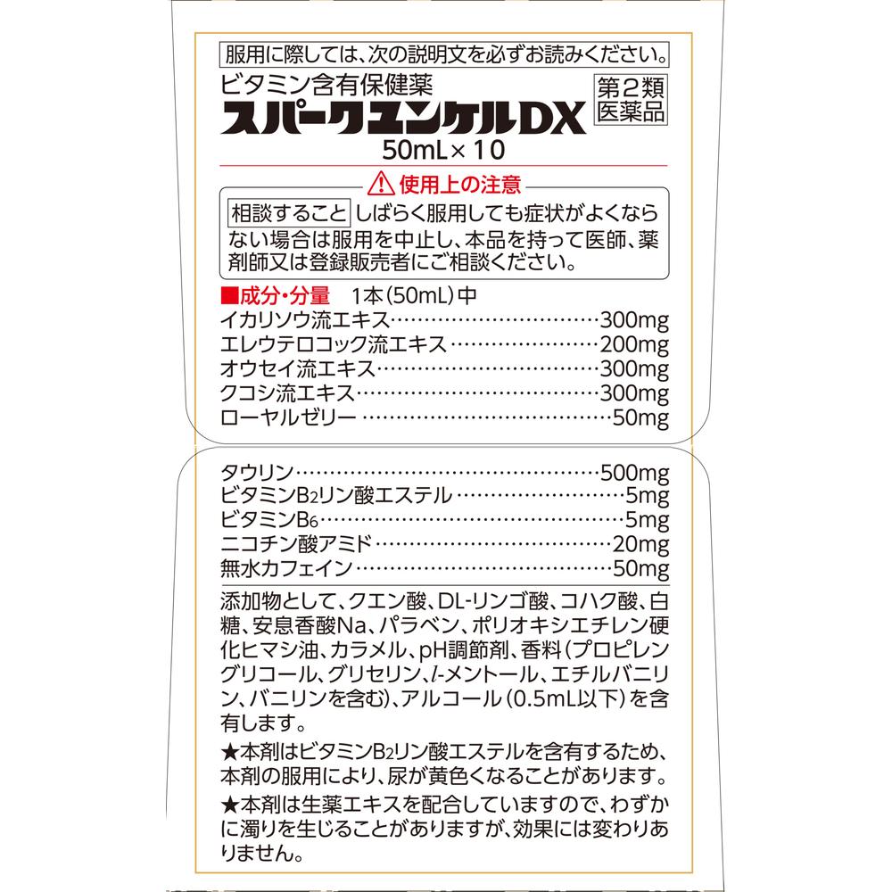 ・服用方法を守ってご使用下さい。 ・元気を出すには栄養剤の他に、バランスよい食事、睡眠も大切です。疲れたら休息をとり、1日3食きちんと食べるよう心がけましょう。 ・お使いになって何か気になる症状が出た場合は、使用を中止し、医師・薬剤師・登録販売者にご相談下さい。 ・使用前に、よく添付文書をお読みになってからご使用下さい。その際、ご不明な点がございましたら、薬剤師・登録販売者にご相談下さい。商品説明●イカリソウ、エレウテロコック、オウセイ、クコシ、ローヤルゼリーの5種の生薬を配合したミニドリンクです。 ●様ーな「疲れ」に効くデラックス(DX)処方で、原生薬として、スパークシリーズ最大の1,150mgを配合しています。