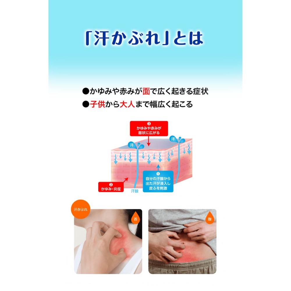 ・かゆみが強い時は冷たいタオルなどを患部にあてるとおさまることもありますので、お試し下さい。 ・薬を塗った後、患部をラップ等通気性の悪いもので覆わないで下さい。また、長期連用しないで下さい。(目安として顔面で2週間以内、その他部位で4週間以内まで) ・お使いになって何か気になる症状が出た場合や、5~6日間使用しても症状の改善が見られない場合は使用を中止し、医師・薬剤師・登録販売者にご相談下さい。 ・使用前に、よく添付文書をお読みになってからご使用下さい。その際、ご不明な点がございましたら商品説明汗かぶれは、汗が自分の皮ふの角層に浸入し、表皮を刺激することで起こります。自分の汗が原因であることを理解した上で適切な治療をしないと、汗をかくたびかゆみ・赤み・ぶつぶつなどの症状をくり返し、ますます悪化させ、なかなかすっきり治らない「汗かぶれループ」にはまり込んでしまいます。 アセムヒEXは「汗の浸入を防ぐ(タンニン酸)・抗炎症(PVA)・かゆみ止め(ジフェンヒドラミン+?-メントール)」の3つのアプローチで、くり返す汗かぶれループを断ち切り、つらい症状をすばやくしっかり治療します。 ※あせもは汗腺が詰まることで起こる「汗腺の位置に点々と赤み、かゆみが起こる症状」、汗かぶれは自分の汗腺から出た汗が浸入することで起こる「面で広くかゆみや赤みが起こる症状」です。