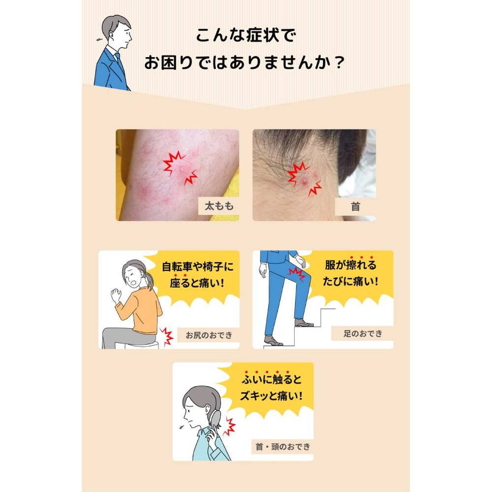 ・患部を清潔にした上でお薬を使用しましょう! ・お使いになって何か気になる症状が出た場合や、5~6日間使用しても症状の改善が見られない場合は使用を中止し、医師・薬剤師・登録販売者にご相談下さい。 ・使用前に、よく添付文書をお読みになってからご使用下さい。その際、ご不明な点がございましたら、薬剤師・登録販売者にご相談下さい。商品説明座る、擦れる、触れると痛い!体の色々な部位にできる早く治したい「痛いおでき」の「膿」と「腫れ」それぞれにアプローチします。 化膿を抑える「スルファジアジン(抗菌剤)」と、腫れを鎮める「ジフェンヒドラミンサリチル酸塩」を配合。 膿が出て、腫れが引くことで、「痛いおでき」をしっかりと治療します。