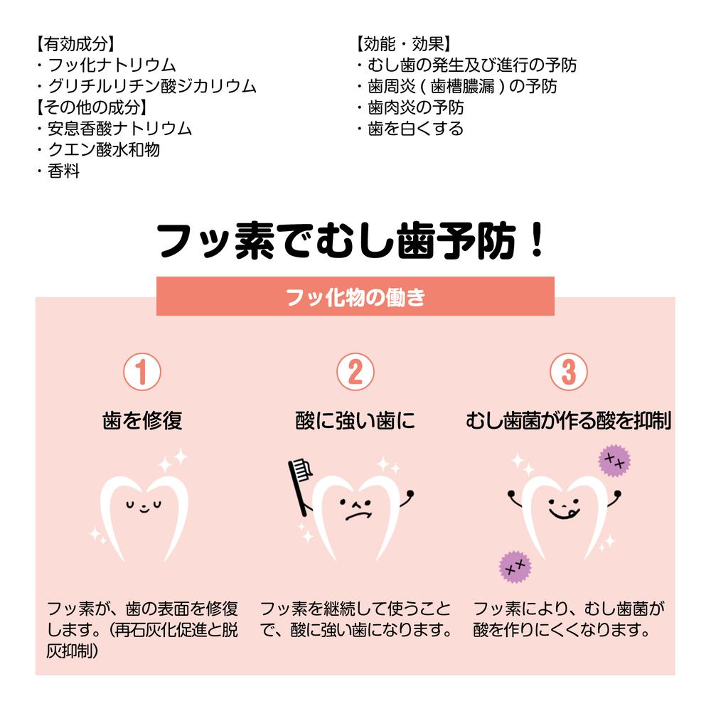ご家庭で手軽にむし歯予防ができるフッ素スプレー。 フッ素は安心の低濃度(100ppm)、すすぎがいらないので歯が生え始めた赤ちゃんにもお使い頂けます。 また、ほのかな甘みとさわやかな使用感でお子様にも大好評。 歯みがきの習慣づけにもピッタリのアイテムです。