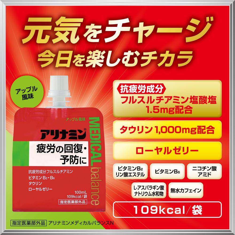 アップル風味 疲労の回復・予防の効能を持ったアリナミン 抗疲労成分フルスルチアミンに加え、ビタミンB2・B6 タウリン、ローヤルゼリーを配合 食欲不振時の栄養補給や、疲労の回復・予防によく効きます。