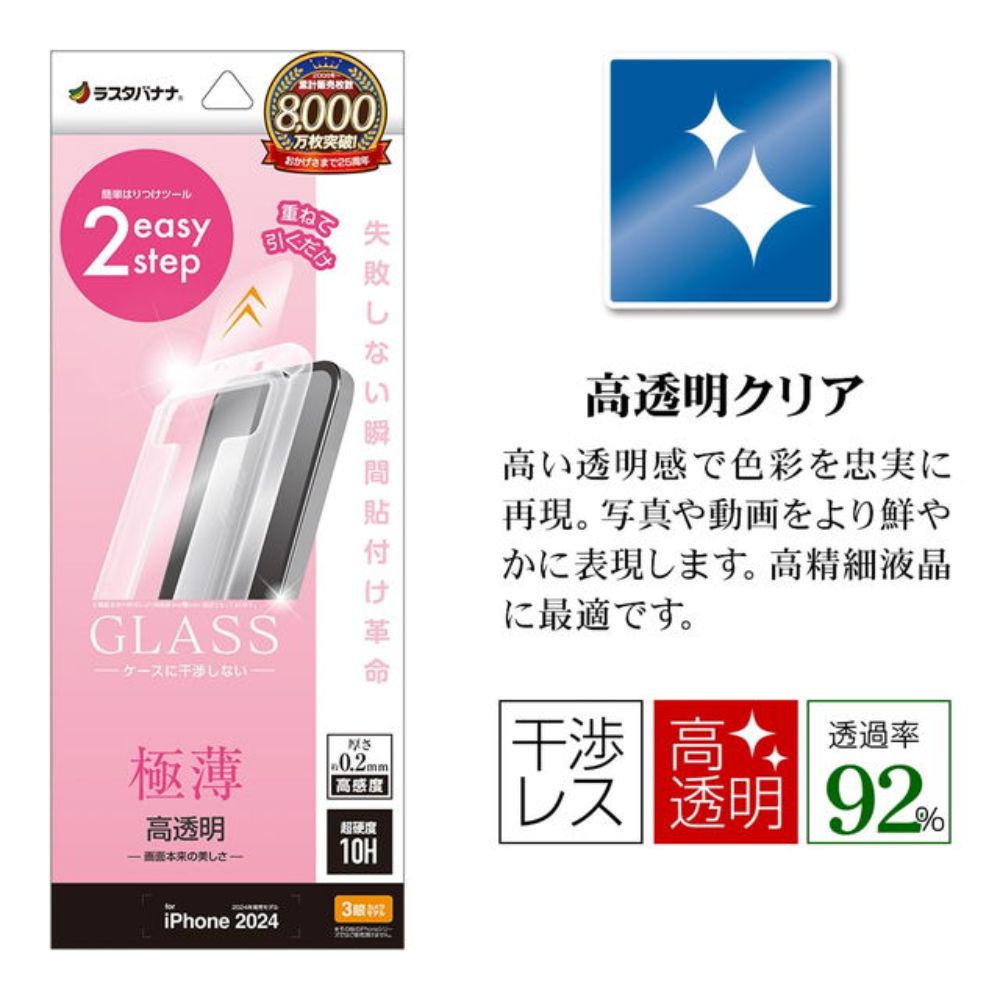 iPhone16Pro、ガラスフィルム、Pro、平面保護、高光沢、高透明、クリア、薄型、高感度、干渉しない、干渉レス、0.2mm、硬度10H、レボリューションガラス、貼付革命、瞬間貼り、アイフォン、保護フィルム、MTK4537IP461P