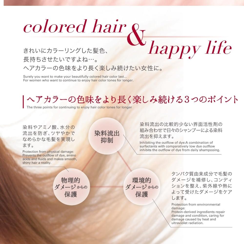 キャラデコヘアパックは紫外線から受けた髪のダメージをケアします。 みずみずしくうるおいをあたえ、髪全体をなめらかにまとめます。 ヘアカラーの色味をより長く楽しみ続ける3つのポイント。 染料流出の比較的少ない界面活性剤の組み合わせで日々の洗髪による染料流出を抑えます。 染料やアミノ酸、水分の流出を防ぎ、ツヤやかでなめらかな毛髪を実現します。 タンパク由来成分でダメージを補修し、コンディションを整え、紫外線や熱によって受けたダメージをケアします。