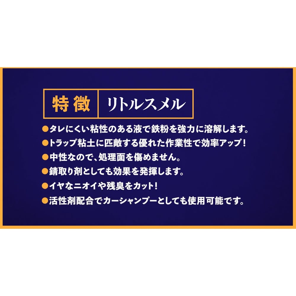 ●車や金属機器などの鉄粉除去剤です。●鉄粉に反応し、液が変色するため、細かな鉄粉も残さず除去します。●中性でカーシャンプーとしても使用できます。●液に粘性があり液だれしにくくなっています。●原料臭を抑えたタイプになります。●錆取り剤としての効果もあります。●容量(kg):1●色:無色●使用濃度:原液 質量1.140kg
