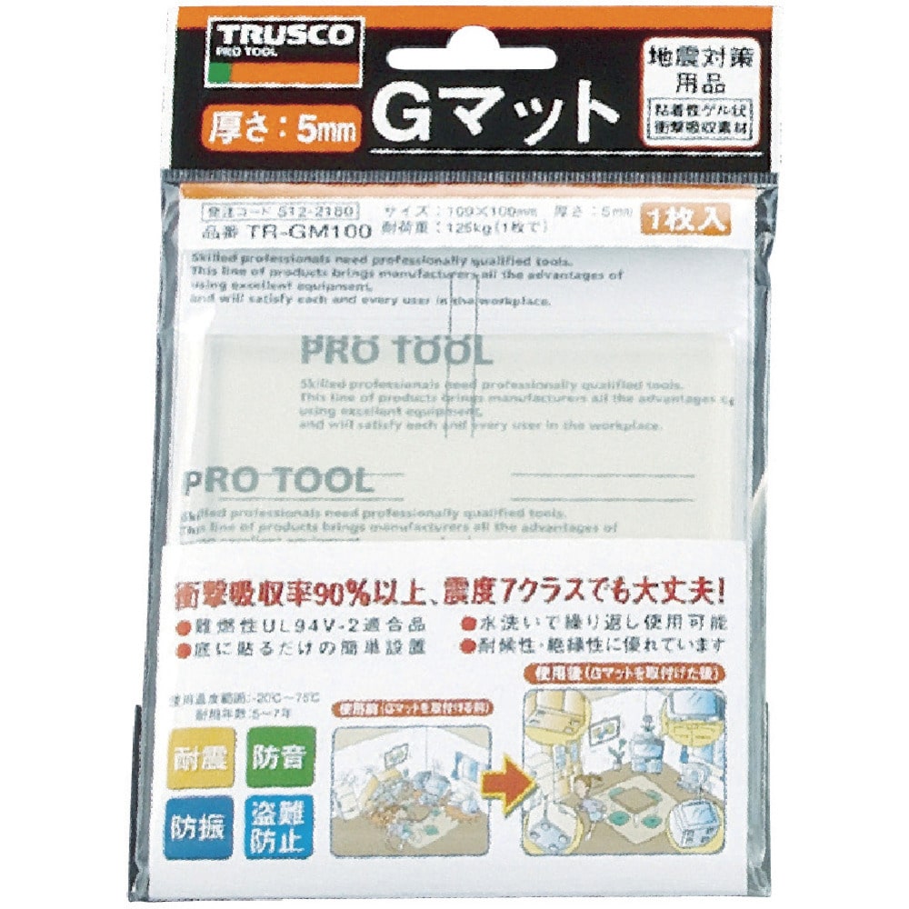 ●衝撃吸収率は90%以上で、震度7クラスでも安心です。●温度変化(-20~75度)においても性能は変わりません。●超弾力性と優れた粘着性で、上下、左右、前後のあらゆる揺れに対応します。●水洗いでくり返し使用が可能です。●工事も不要。底に敷くだけで簡単に設置でき、設置面が平らでない場合でも取り付けできます。●耐候性・絶縁性に優れています。●Gマットとは、半固形状のもの(ゲル)に粘着性をプラスした超軟質ゴムの全く新しい素材です。●厚さ(mm):5●幅(mm):200●長さ(mm):200●均等荷重(kg):500(1枚で)●耐荷重(kg):500(1枚で)●色:透明 質量235g