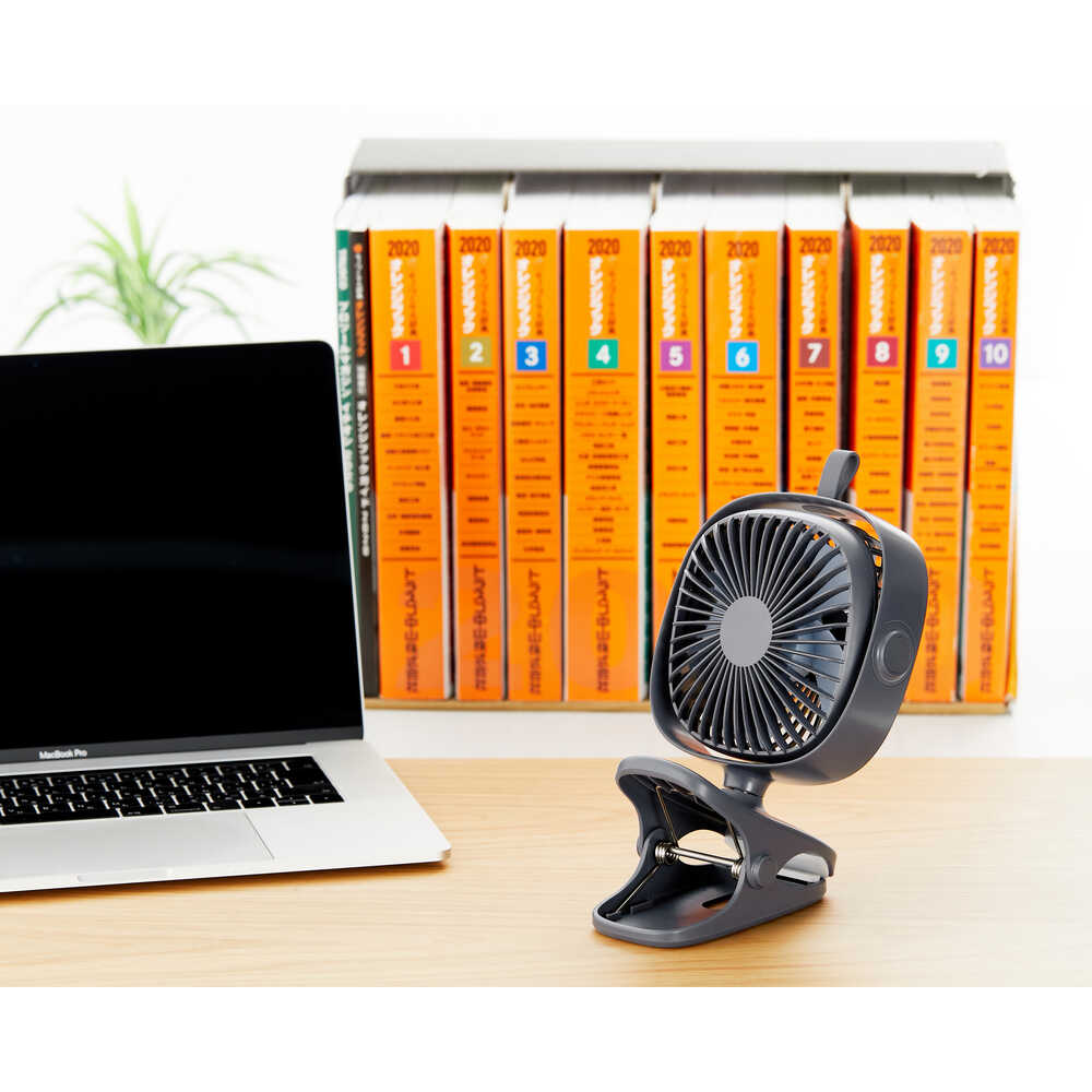 ●クリップ式と卓上式の2WAYで使えるポータブルクリップファンです。●microUSBで充電可能です。●風量4段階(弱・中・強・リズム風)で切り替え可能です。●手動で上下左右360度自由に角度調整が可能です。●色:グレー●奥行(mm):104●縦(mm):201●横(mm):150●定格入力:DC5V/0.5A●定格消費電力:4W●使用可能時間:弱:4時間、中:2時間、強:1~1.5時間、リズム風:3~4時間●内蔵電池:リチウムイオン電池2000mAh●microUSBケーブル:150cm●クリップ取り付け最大板厚:5cm 質量380g