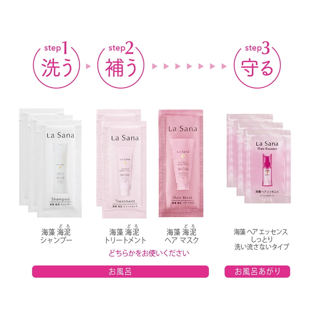 『シャンプー、トリートメント、ヘアマスク、ヘアエッセンス』のお試しセット ワンコインで髪のトータルケアができるパウチセットになります。