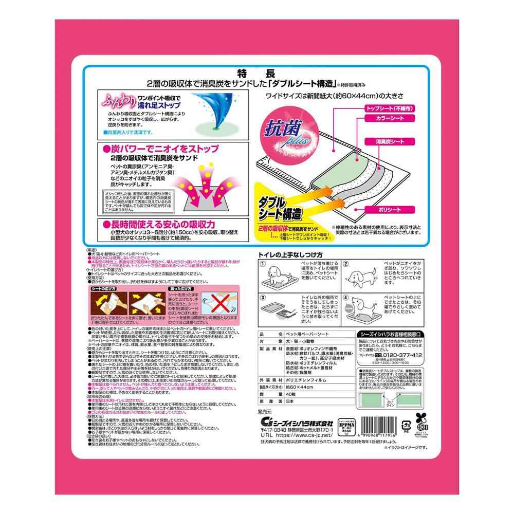 ふんわりワンポイント吸収で濡れ足ストップ。 ふんわり吸収面とダブルシート構造によりオシッコをすばやく吸収し、広がらず、逆戻りを防ぎます。 ■抗菌剤入りで清潔です。 炭パワーでニオイをストップ。 2種の吸収体で消炭をサンド。ペットの糞尿臭などのニオイの粒子を消臭炭がキャッチします。 オシッコ3~5回分を安心吸収。(小型犬の場合)