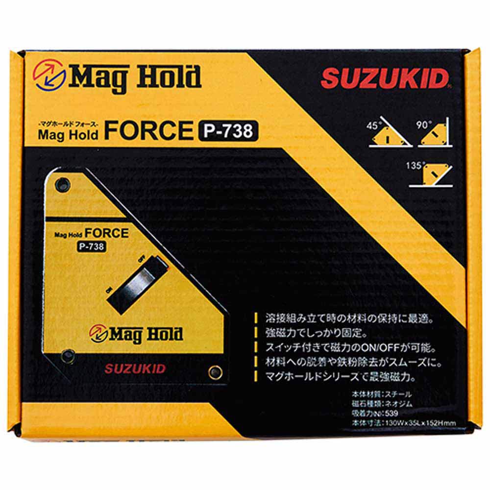 溶接作業時の位置決めや、角度保持の際に両手がフリーになります。 溶接組み立て時の材料の保持。 スイッチ付でワークへの取付・取外しが手軽にでき、使っていない時に鉄粉が付着する心配もないのでストレスフリーです。 力強い保持力を求める方や、大きな作品作りをされる方にオススメの、マグホールドシリーズ随一の強力モデルです。 45度/90度/135度の角度での保持が可能です。 ●本体サイズ:幅130×奥行152×高さ35mm。 ●質量:1300g。 ●保持角度:45度・90度・135度。 ●吸着力:539N。 ●磁力スイッチ付。
