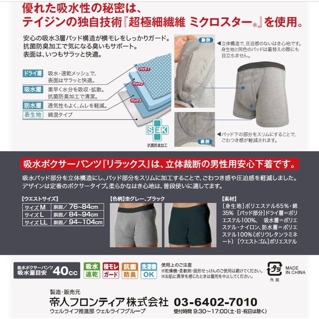 見た目がオシャレで普段の下着!これで旅行・温泉・ジムも安心、はずかしくない! トイレを気にせず、生活サポート! 吸水パッド部分を立体構造にし、パッド部分をスリムに加工することで、ごわつき感や圧迫感を軽減しました。 デザインは定番のボクサータイプ。柔らかな履き心地は普段使いに適しています。