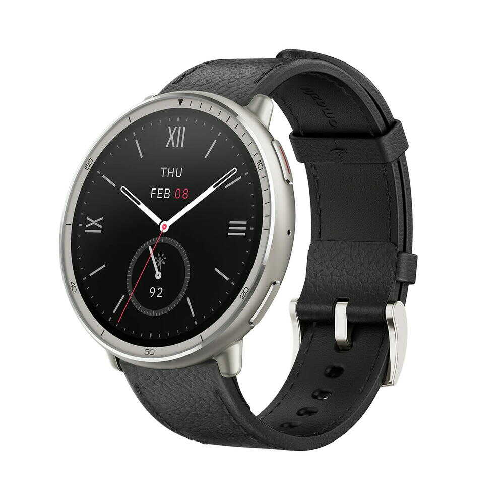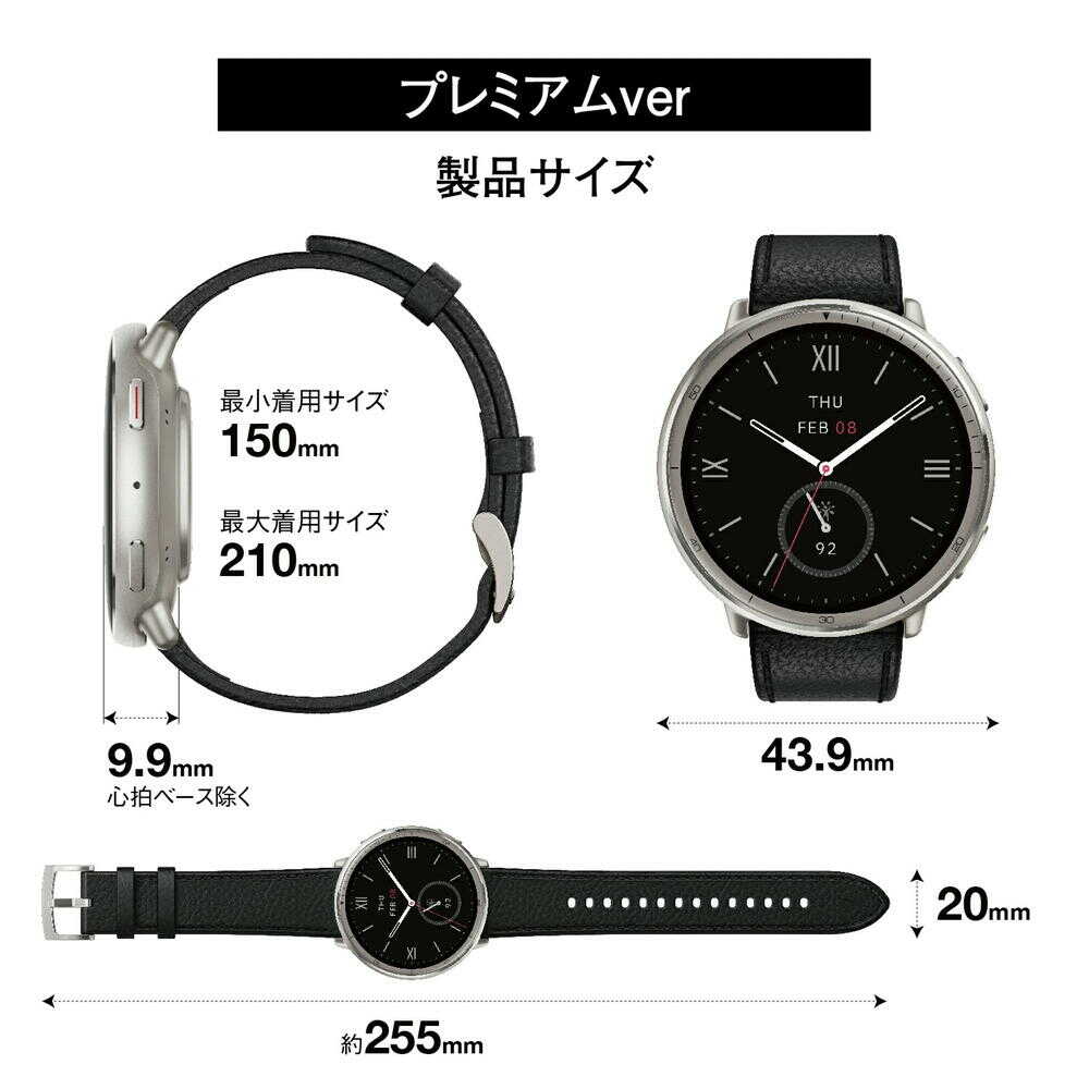 ・輝度2,000nitの明るいAMOLEDディスプレイ ・本体はステンレススチール製の洗練されたデザイン ・サファイアガラス/レザーベルトで比類なき上品さ ※プレミアムバージョンのみ ・Amazfit上位モデルに採用されているBioTracker搭載で正確なデータを計測 ・160種以上のワークアウトモードに対応 ・10日間のロングバッテリー搭載 ・健康や運動状態を確認できる無料の Zepp アプリ利用可能 ・方向転換を示すオフラインマップ機能搭載 ・音声操作システム“Zepp Flow”搭載、音声メッセージ回答 ・iPhone/Android に対応 ・着信通知 / LINE通知への返信※Androidのみ