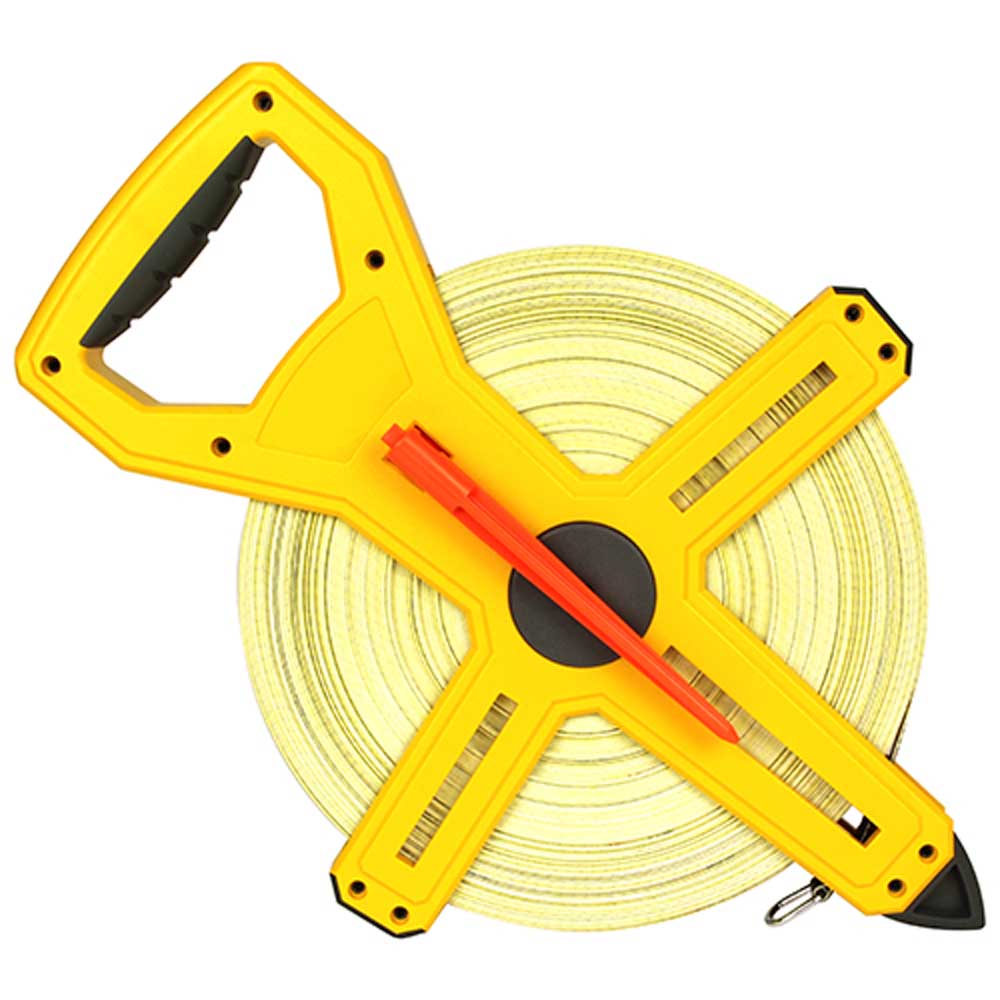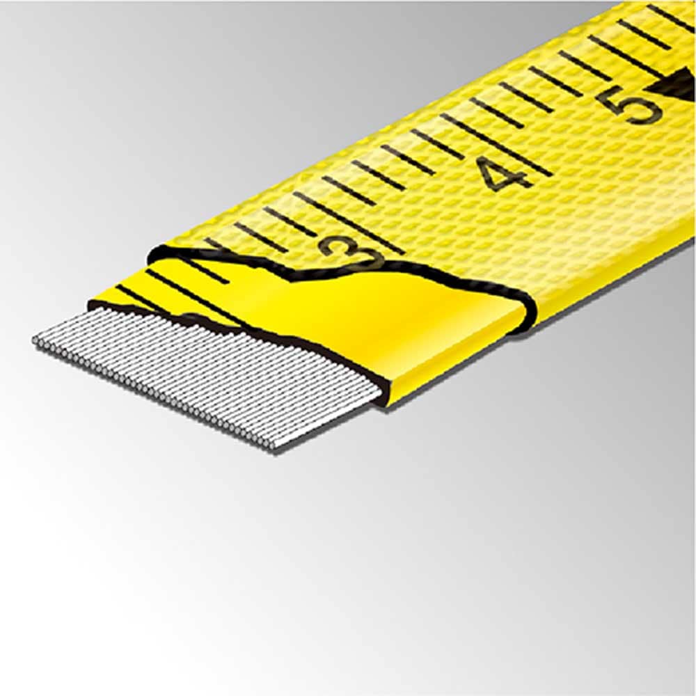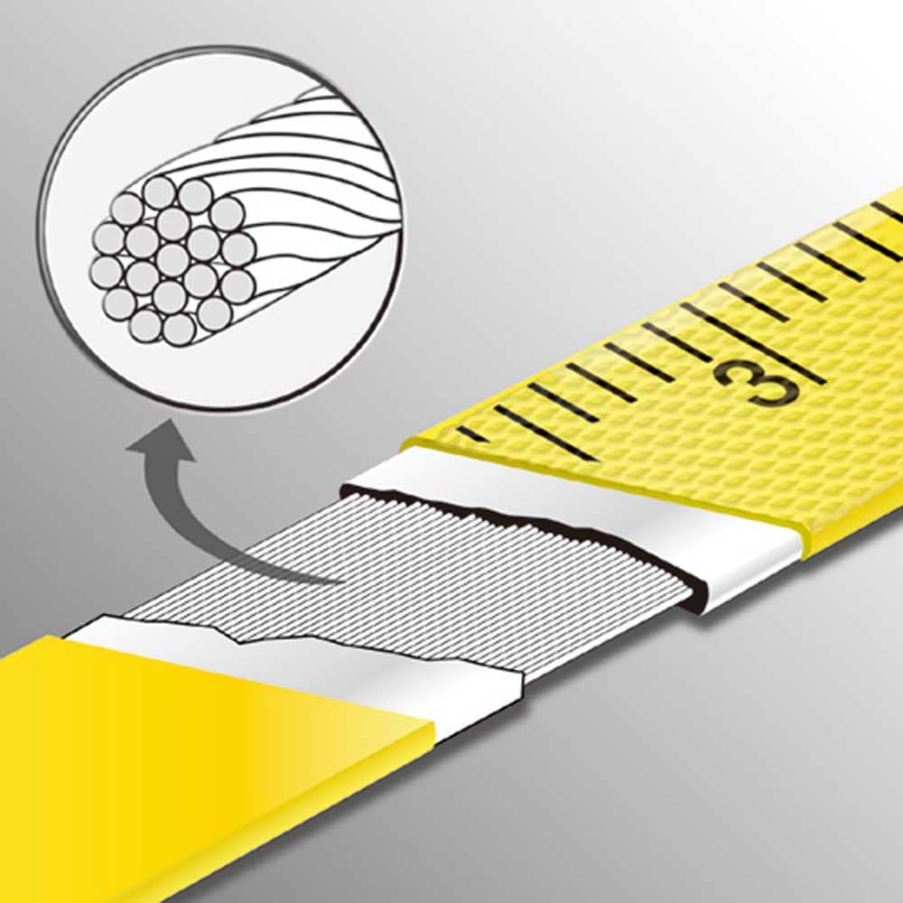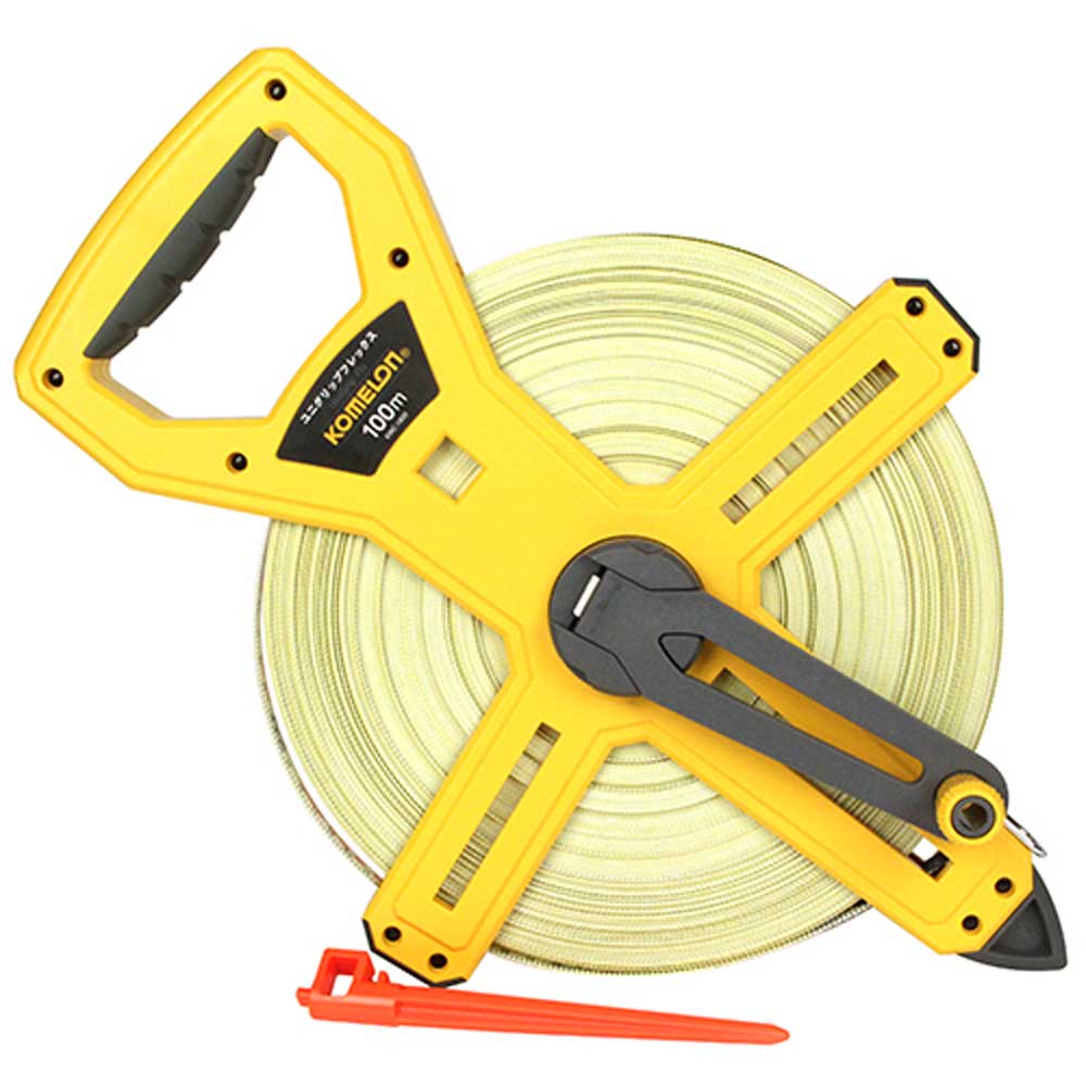 衝撃に強いラバーバンパー装着で耐久性が向上しました。 長さの測定。 目盛や文字が摩耗しにくい特殊ダブルコートです。 15000フィラメントのガラス繊維で成形された、世界最高クラスの引張強度です。 白色と黄色のツートンカラー両目目盛でよじれが一目でわかります。 ●テープ幅:13mm。 ●テープ長さ:100m。 ●JIS1級。 ●テープ仕様:磨耗に強いダブルコートガラス繊維性テープ。