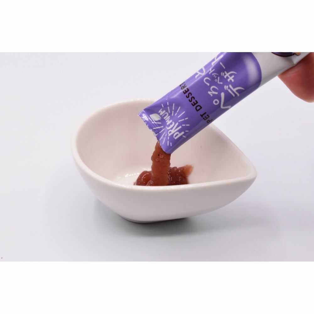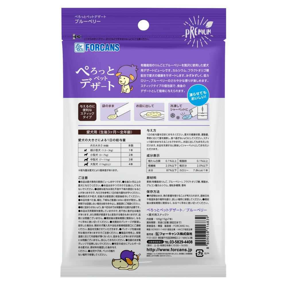 果実を贅沢に使用した、愛犬用デザートピューレ。 砂糖や塩を使っていないわんちゃん用のデザートです。 袋のままあげてもよし、お皿にのせてあげてもよし。 暑い夏には凍らせてシャーベットに! ピューレ状態のデザート。 冬場は乾燥しがちな愛犬への水分補給や、夏場は凍らせて夏バテ予防に。 超小型犬(1.5~3kg)1本、小型犬(3~7kg)2本、中型犬(7~11kg)3本、大型犬(11~22kg)4本