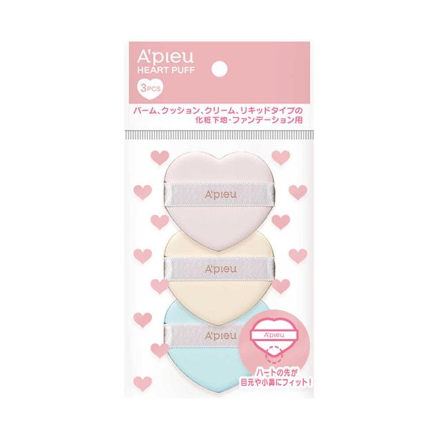 かわいい見た目でメイクを楽しく!小回りの利く先端が使いやすさ抜群!アピューハートパフ(3個入り)。 スキンケアプライマーの替えパフや、その他の化粧下地・ファンデーション用パフとしてお使いいただけます。 目元や小鼻周りはハートを逆さまにして先端で塗ると塗りやすさアップ! アピュー パフ ハート