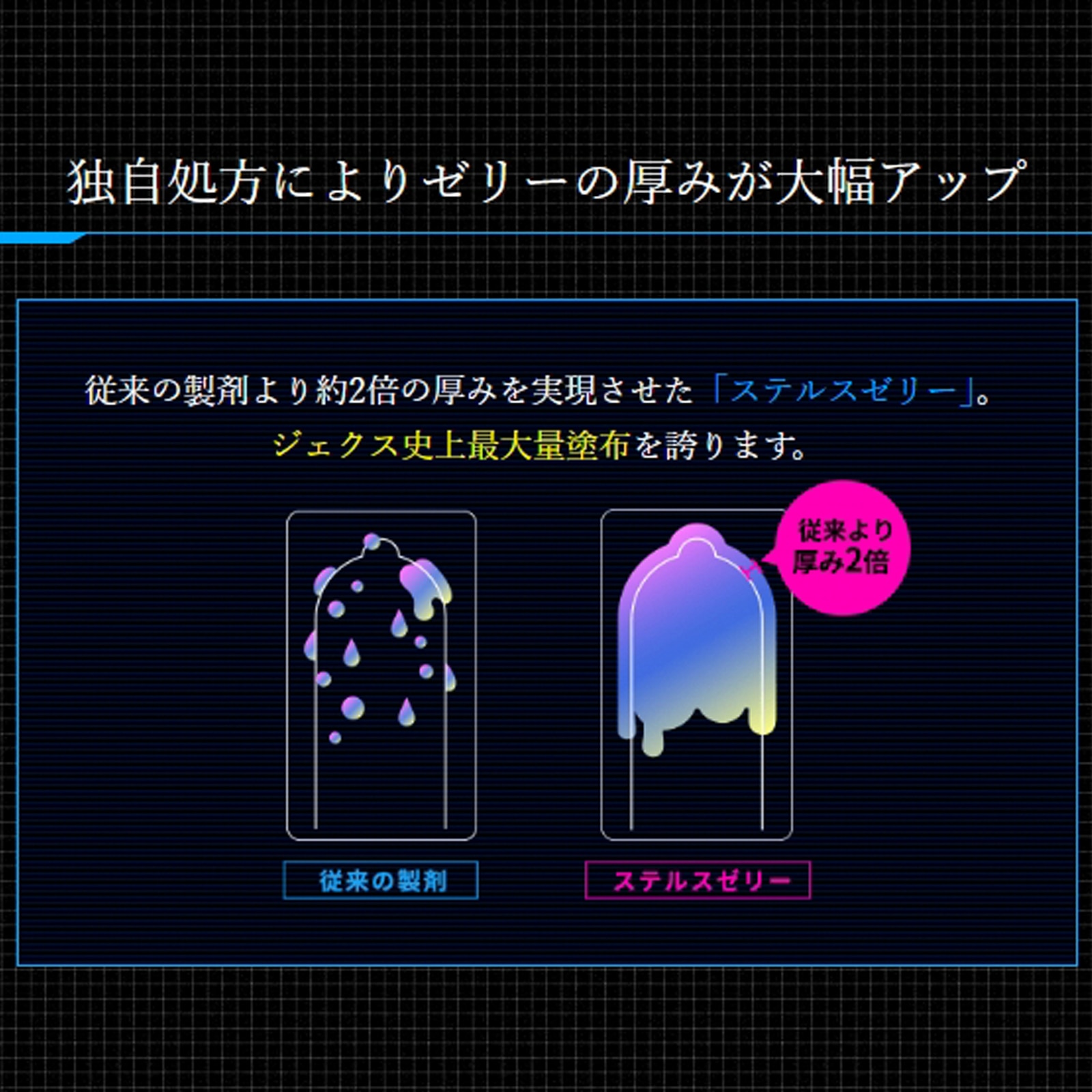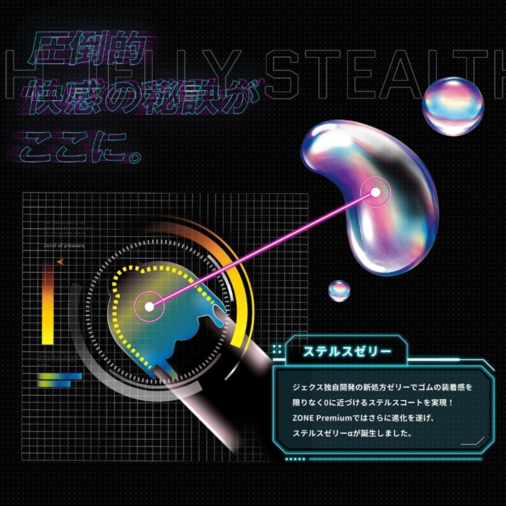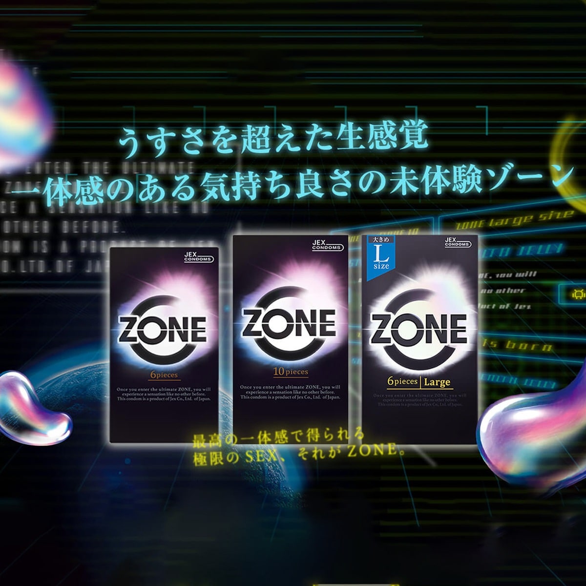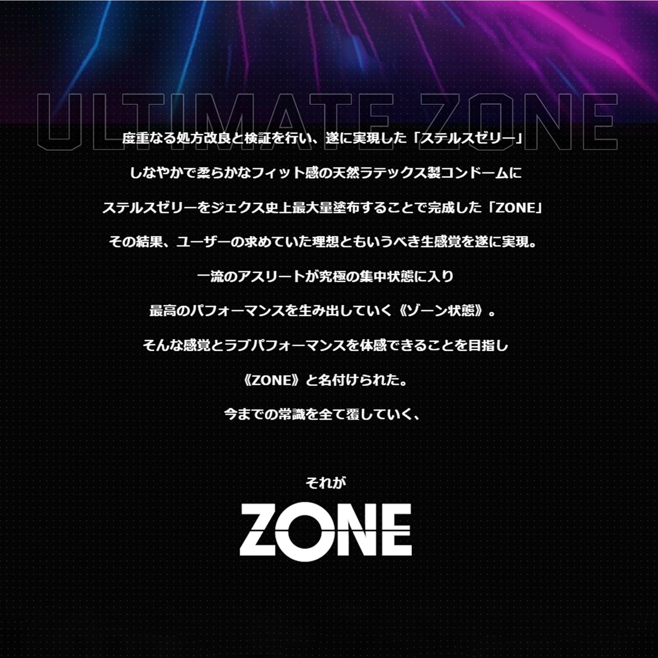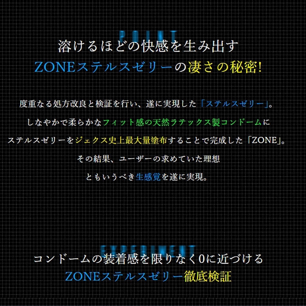 商品情報 ●度重なる処方改良と検証を行い、遂に実現した「ステルスゼリー」。 ●しなやかで柔らかなフィット感の天然ラテックス製コンドームにステルスゼリーをジェクス史上最大量塗布することで完成した「ZONE」。 ●その結果、ユーザーの求めていた理想ともいうべき生感覚を遂に実現。 詳細仕様 ●管理医療機器証番号:224AKBZX00088000 ●内容量:10個入り ●素材:ラテックス製 ●管理医療機器