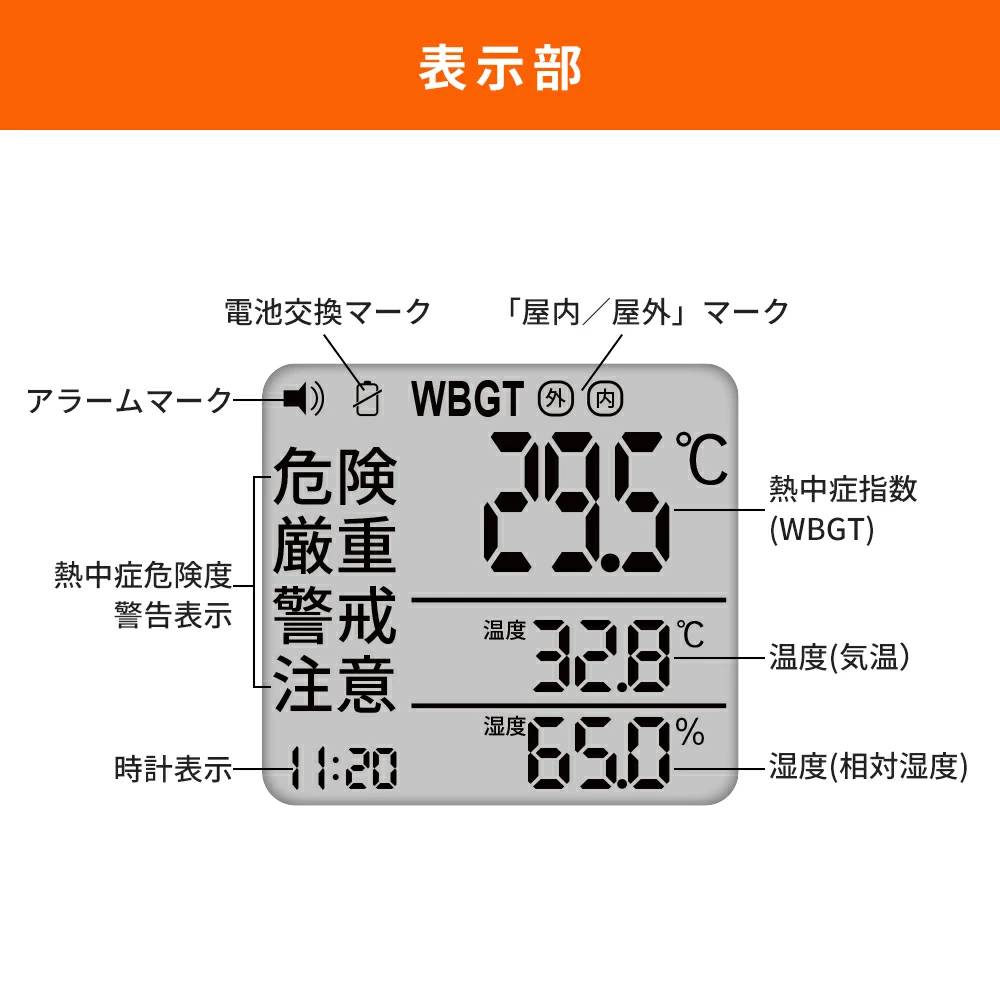 大画面でバックライトが付いているため、屋外でも表示がはっきりと見えます。一つの画面で暑さ指数・温度・湿度・警告表示が見れるようになっています。