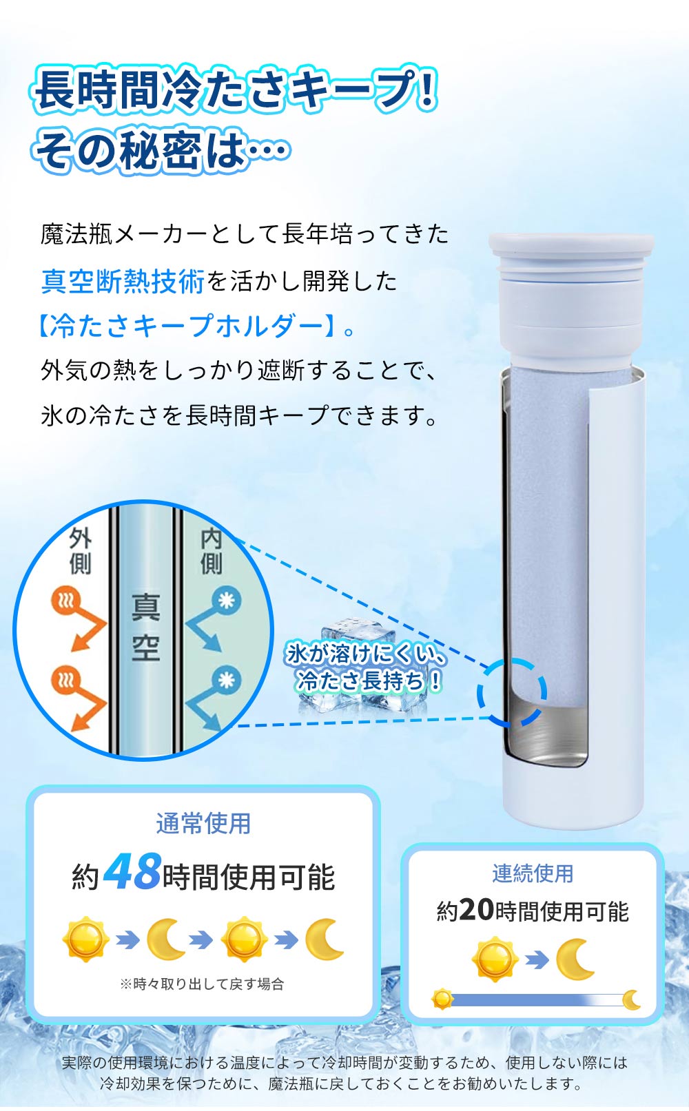 【長時間温度を保つ】魔法瓶メーカーが作る真空断熱構造で、中の温度を長時間保ちます。0°が約20時間保ちます。