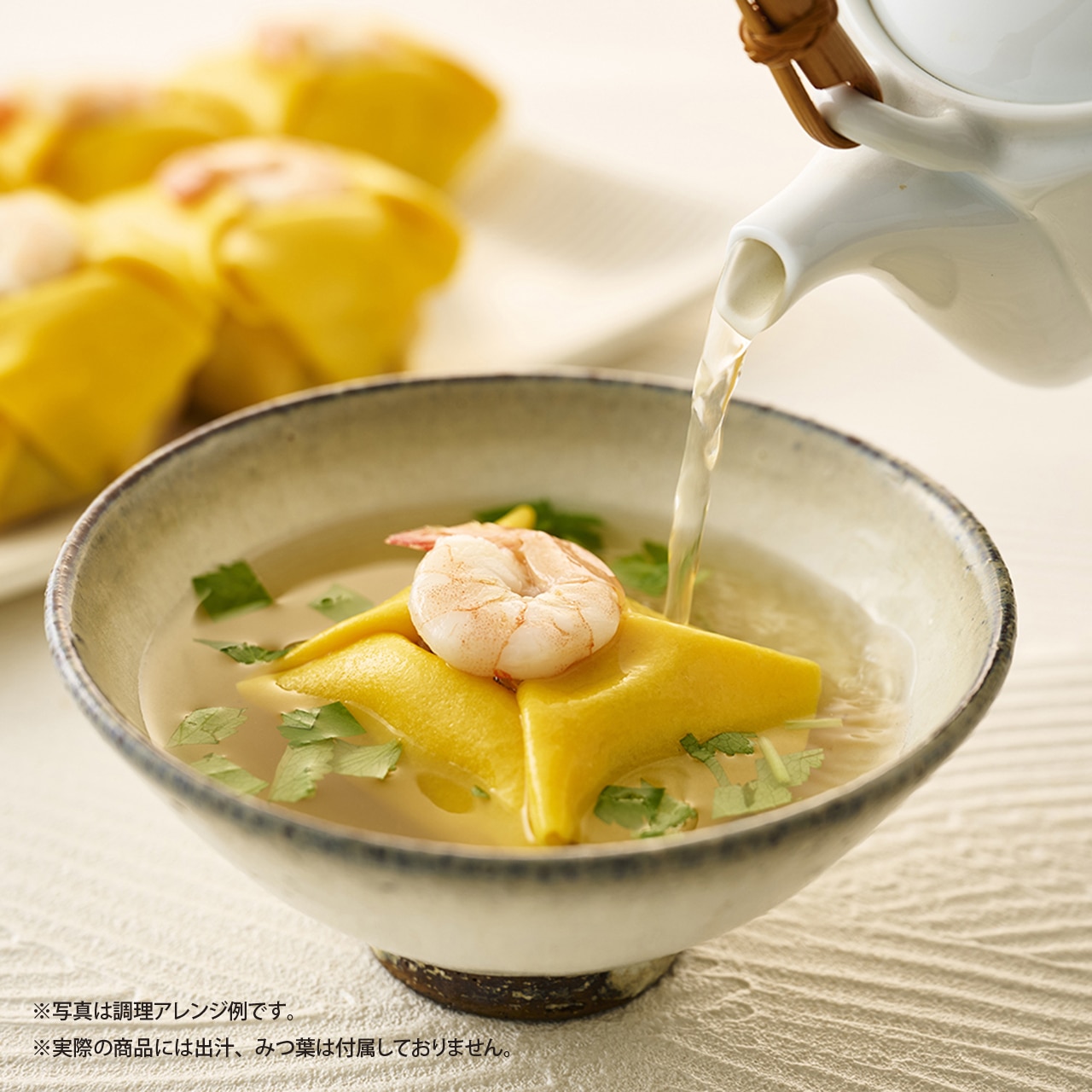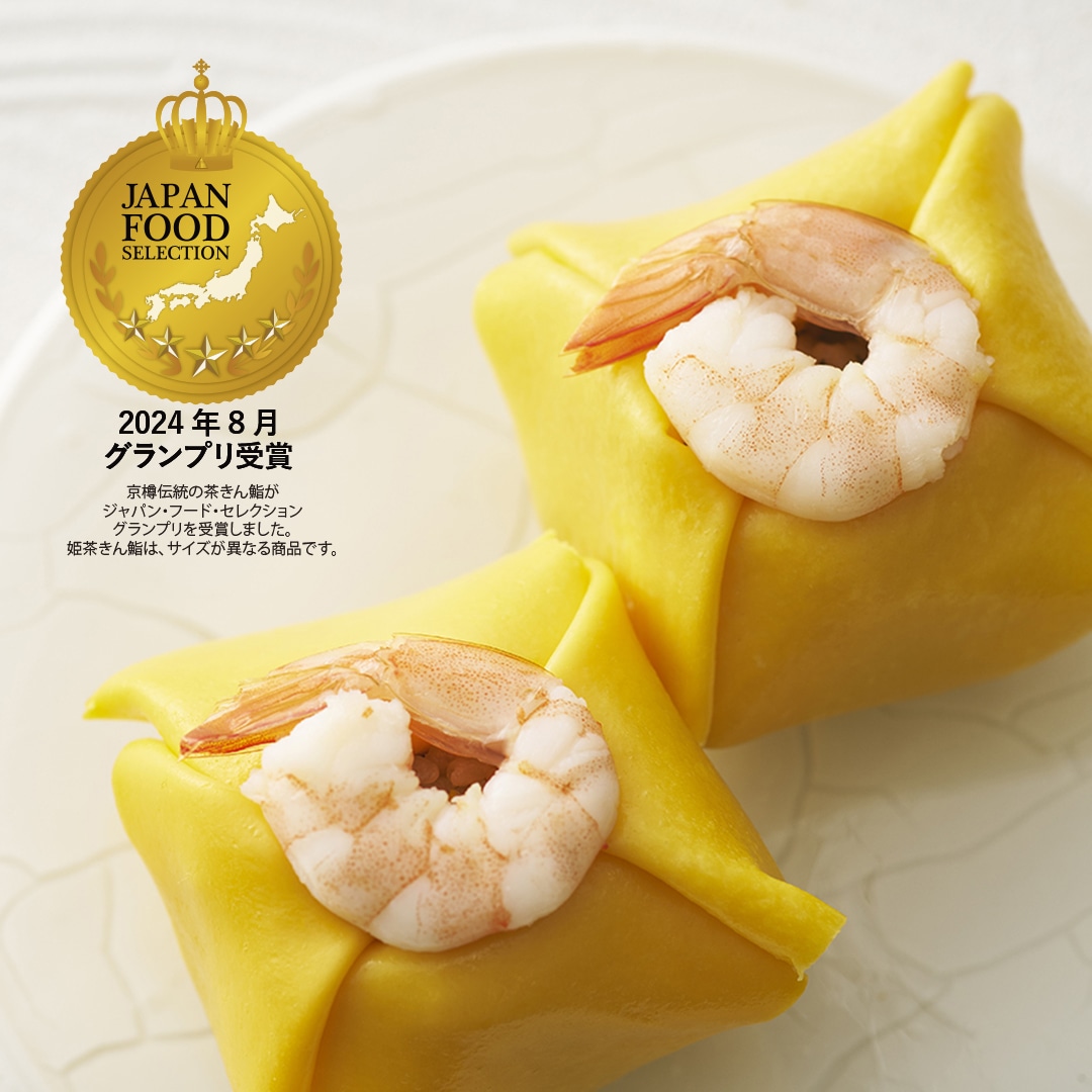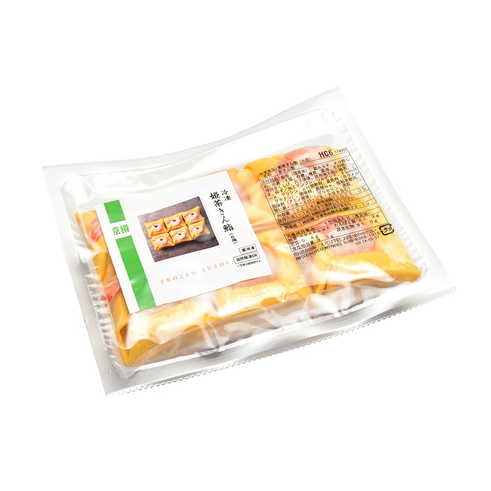 京樽の伝統の茶きん鮨を一回り小さく食べやすいサイズに仕立てた冷凍包み鮨です。 サイズは小さくても、茶きん鮨と同様の伝統の混ぜシャリを使ったこだわりの一品です。