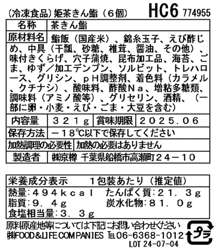 鮨飯(国産米)、錦糸玉子、ボイルえび、中具(干瓢、砂糖、椎茸、醤油、その他)、味付きくらげ、穴子蒲焼、昆布加工品、海苔、ごま、ゆず/加工デンプン、ソルビット、トレハロース、グリシン、pH調整剤、着色料(カラメル、クチナシ)、酸味料、酢酸Na、増粘多糖類、グリセリン、酒精、調味料(アミノ酸等)、(一部に卵・小麦・えび・ごま・大豆を含む)