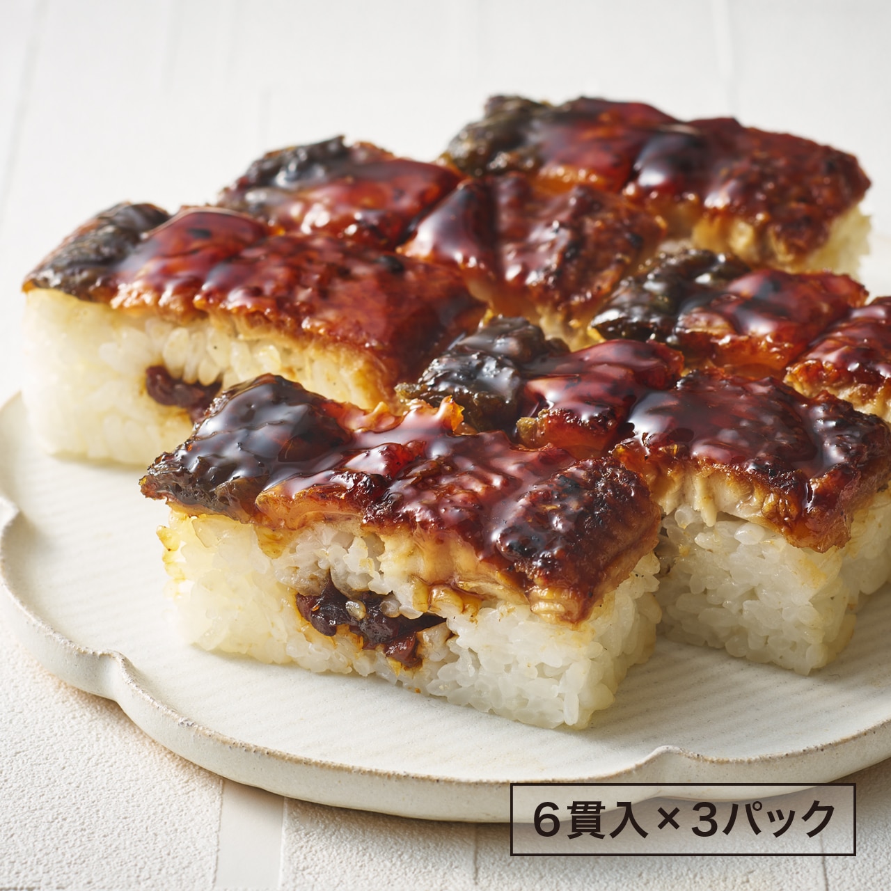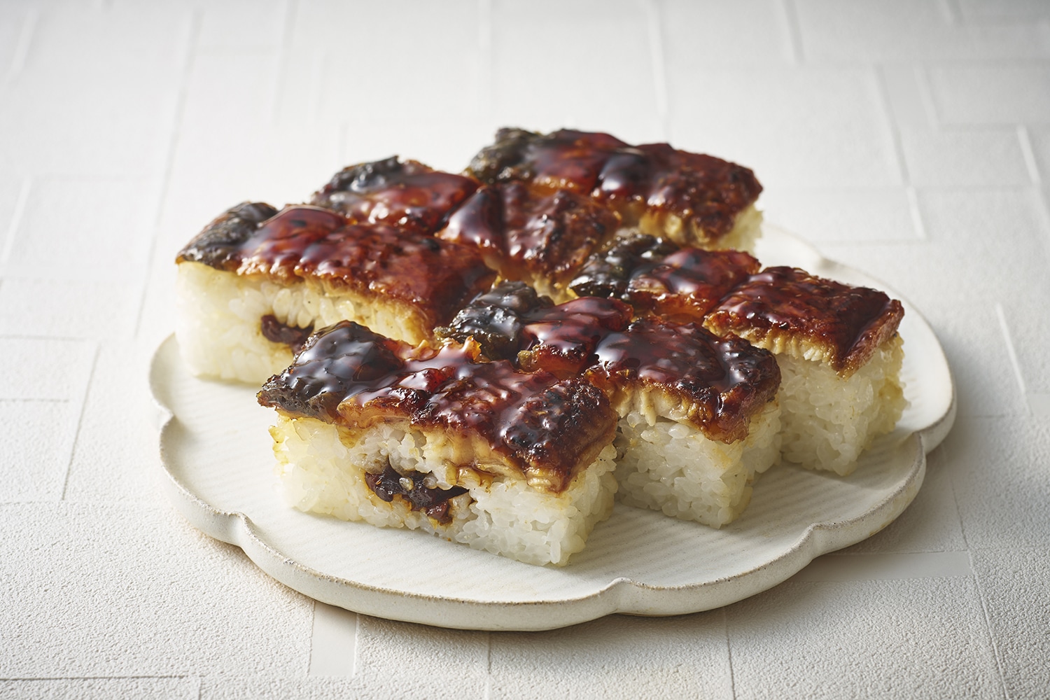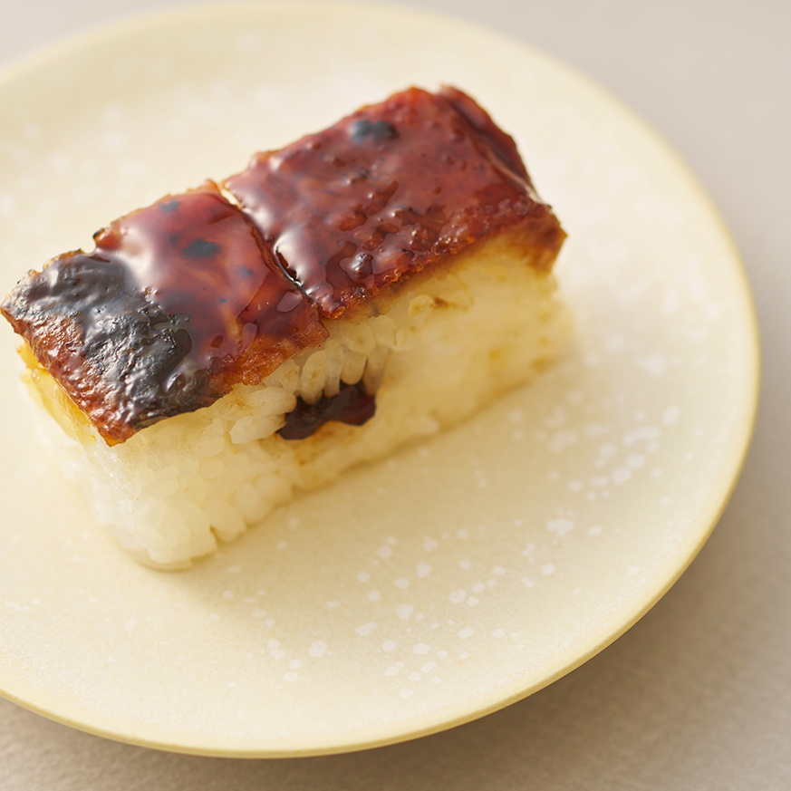 伝統的な上方鮨の技術で作った、うなぎの押し鮨です。椎茸と干瓢の旨味を加えた優しい甘さがうなぎの旨味を 引き立てます。具材とシャリのバランスが美味しい押し鮨です。