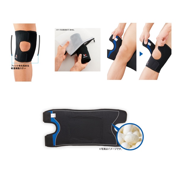 薄くて軽い素材を使用し、手軽にヒザ周辺をサポート。コンパクトなので、持ち歩きも便利。