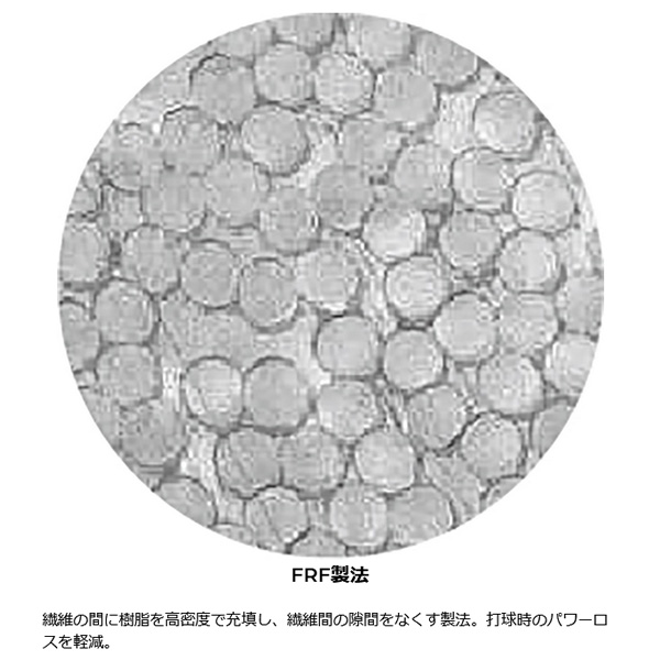 繊維の間に樹脂を高密度で充填し、繊維間の隙間をなくす製法。打球時のパワーロスを軽減。