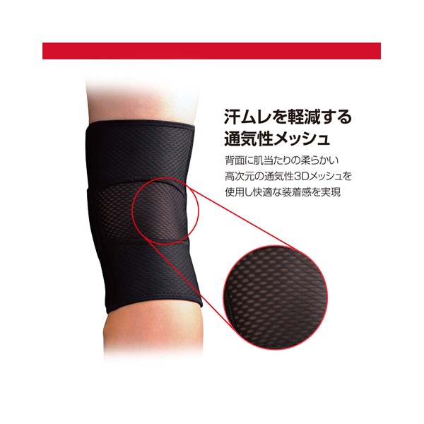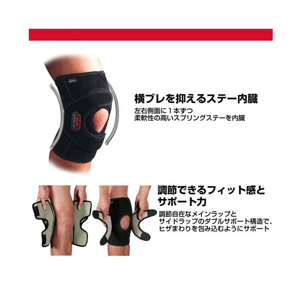 調節自在なメインラップとサイドラップのダブルサポート構造で、ヒザ周りを包み込むようにサポート。