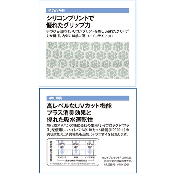 素材:手の甲側=ポリエステル83%+ポリウレタン17% 手のひら側=ナイロン60%+ポリウレタン40%